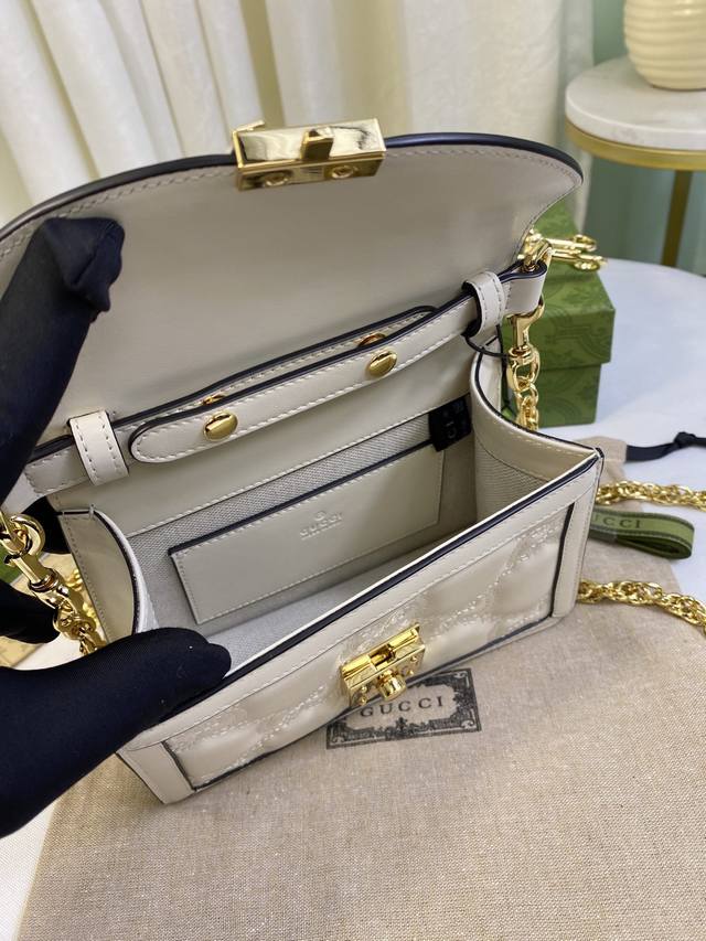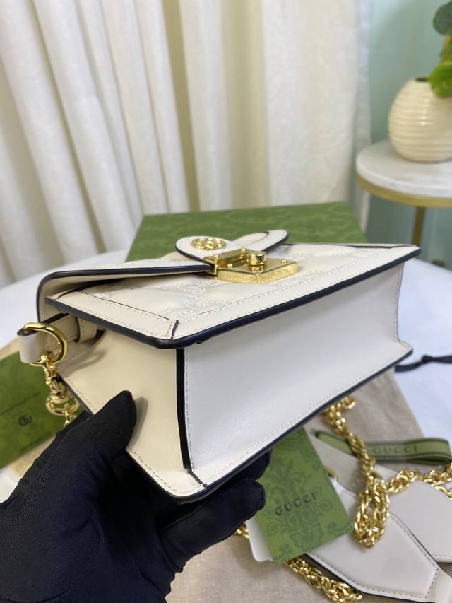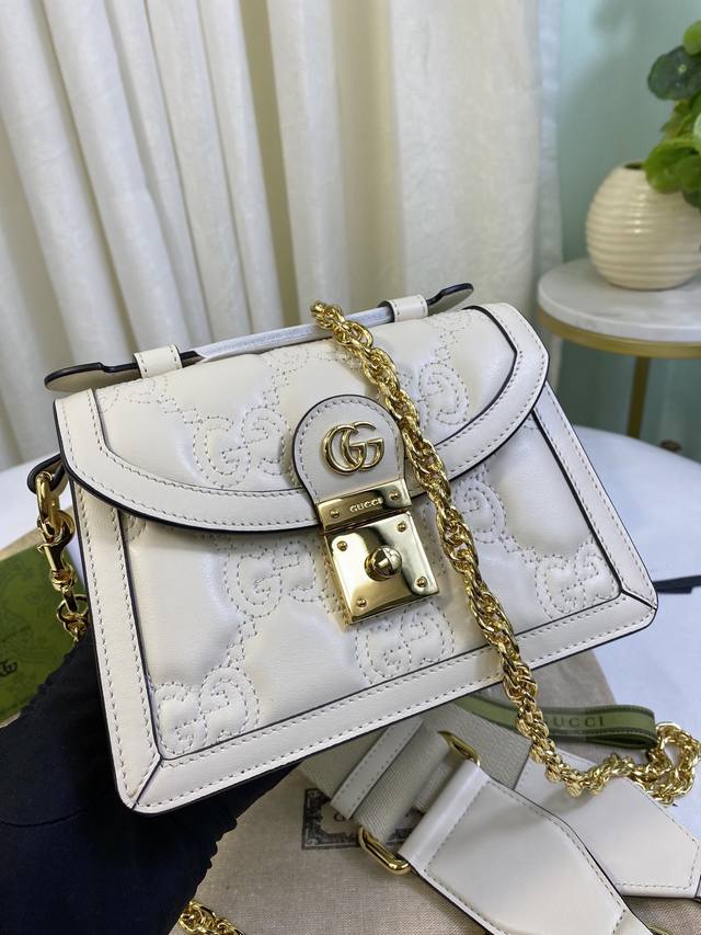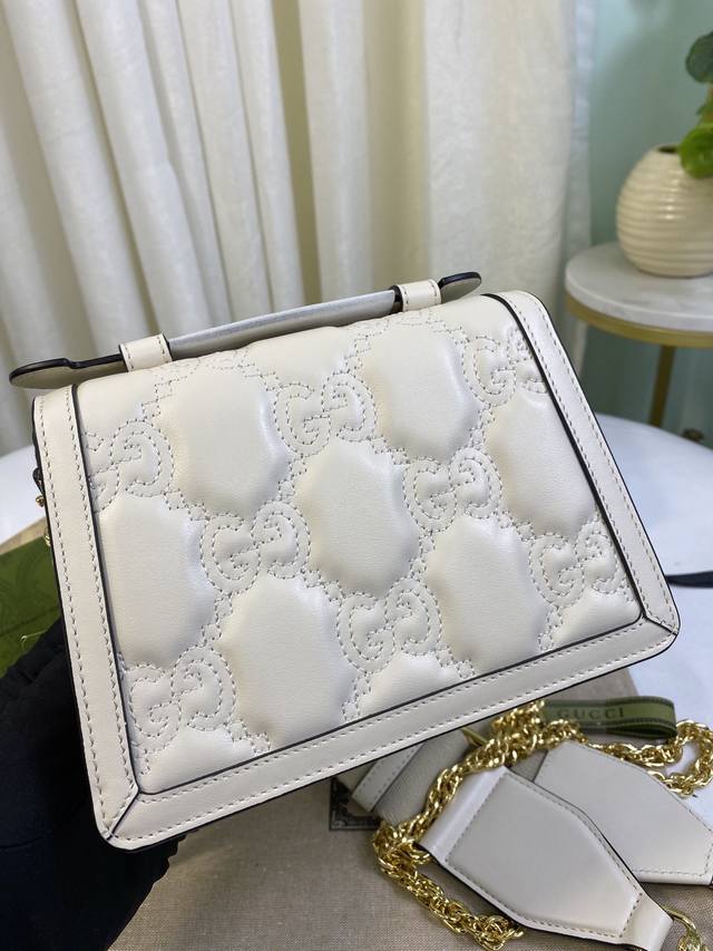 简介:Matelassé皮革在每一季都通过别致的设计风格呈现在品牌创作总监的前沿设计中。质感柔软的标志性材质结合富有纹理感的几何图案,为手袋系列焕新打造时尚力作。整体设计以现代手法演绎90年代标识风尚,为这款白色皮革手提包增添迷人魅力。白色Matelassé皮革,金色调配件双G,另配有帆布肩带,提手高约2.5厘米,金属链背带搭扣。