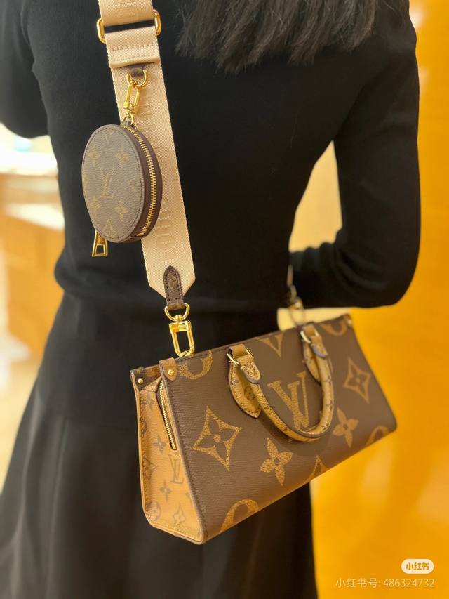 顶级原单全钢五金M46653老花本款 Onthego 托特包融合 Giant Monogram 和 Monogram Reverse 帆布,焕新演绎 East West 的充裕构型。可拆卸圆形零钱袋丰富细节,Toron 顶部手柄和可拆卸宽幅肩带实现多种背携方式。