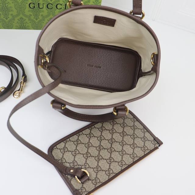 Ophidia系列迷你托特包 Ophidia系列以全新尺寸和款式焕新演绎,这款迷你托特包搭配可拆卸手拿包和可拆卸皮革肩带,灵活缔造多种背携体验。米色和乌木色Gg Supreme帆布巧妙搭配浅金色调双G造型配件。