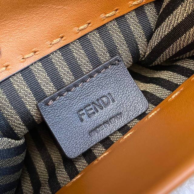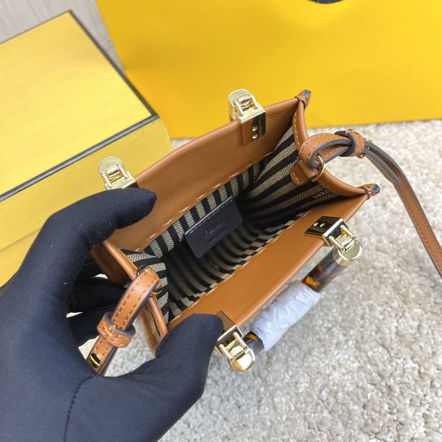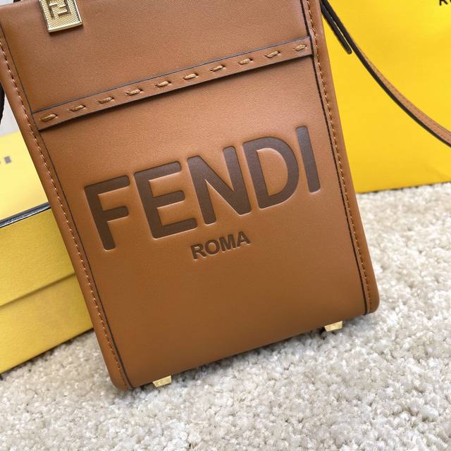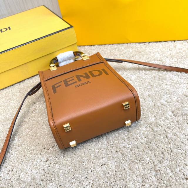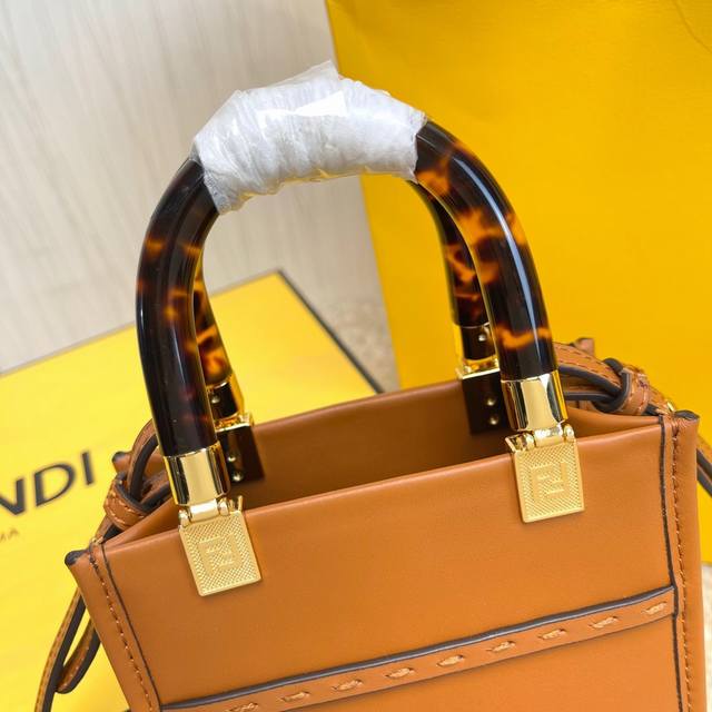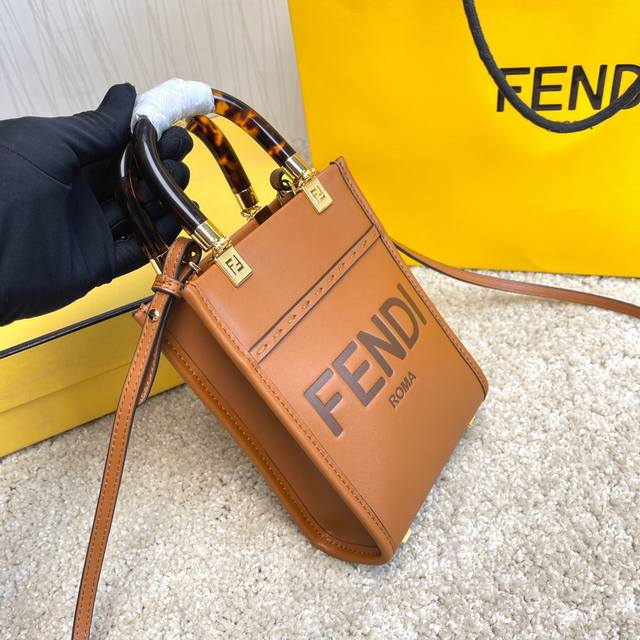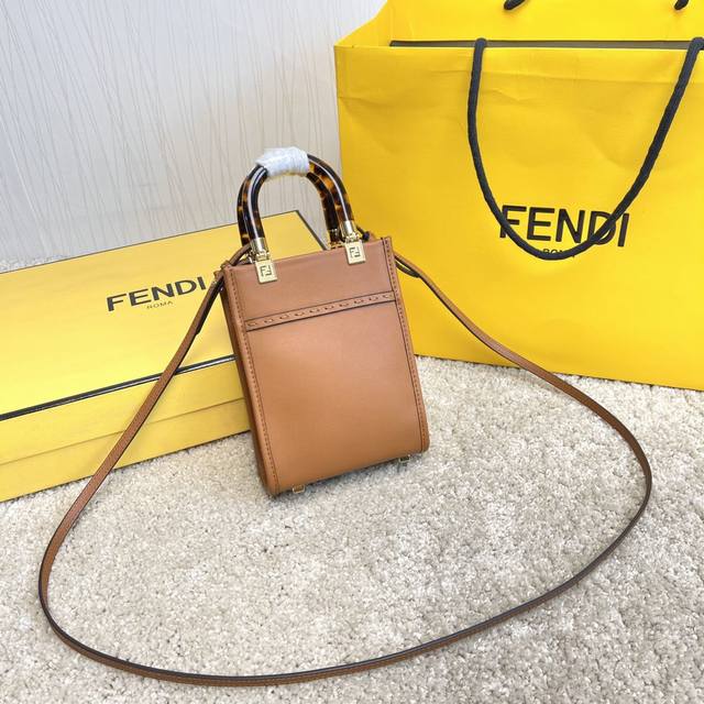 原单Sunshin棕色皮革迷你手提袋 饰有烫印Fendi Roma字样和玳瑁效果硬质有机玻璃提手 配备带衬里内部隔层 点缀同色系皮革饰边和金色金属件 采用两个提手和可调节可拆式细肩带 既可手提 又可肩挎Size:13Cm.18Cm.6.5Cm 8873