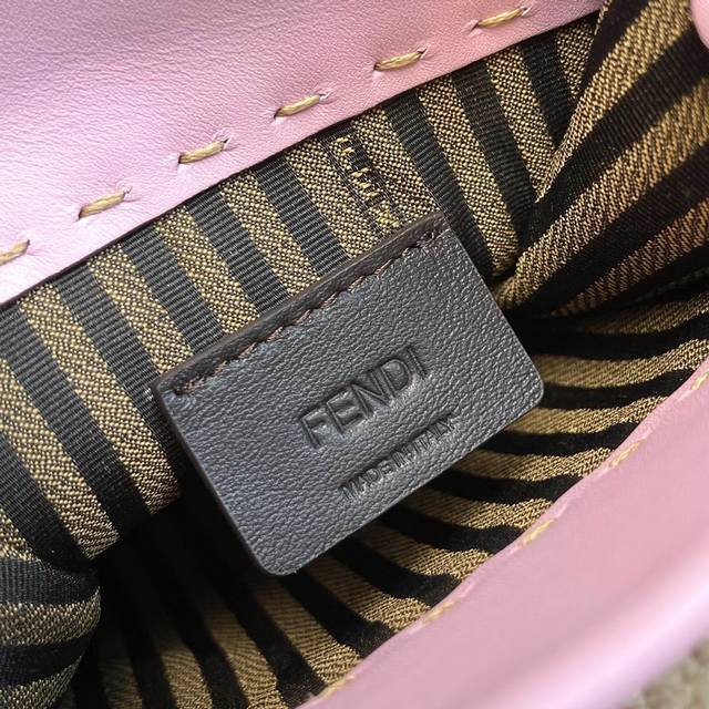原单Sunshin粉色皮革迷你手提袋 饰有烫印Fendi Roma字样和玳瑁效果硬质有机玻璃提手 配备带衬里内部隔层 点缀同色系皮革饰边和金色金属件 采用两个提手和可调节可拆式细肩带 既可手提 又可肩挎Size:13Cm.18Cm.6.5Cm 8873