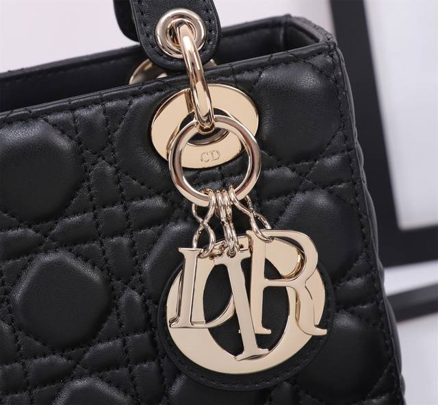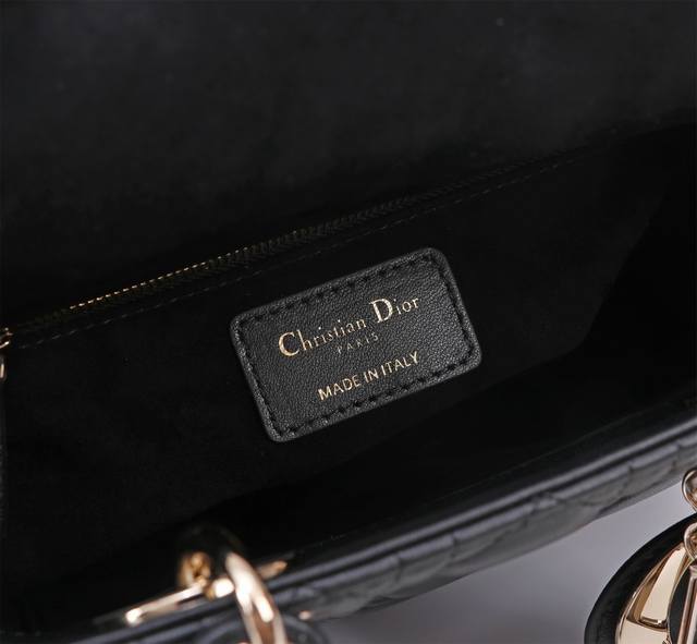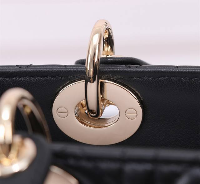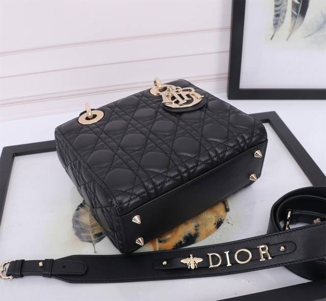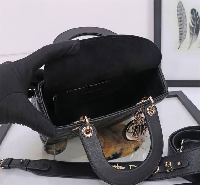 藤格纹漆皮牛皮革迷你手袋,Cannage藤格纹缝线装饰,和浅金属配饰。 肩带可饰以徽章彰显个性,可手提、肩背或斜挎。搭配可个性化宽肩背带,默认+Dior +三叶花 6枚徽章,亦可自选6枚徽章。