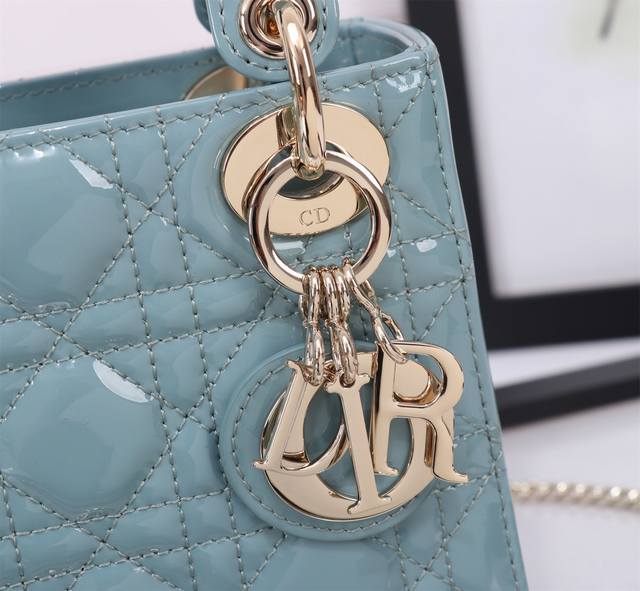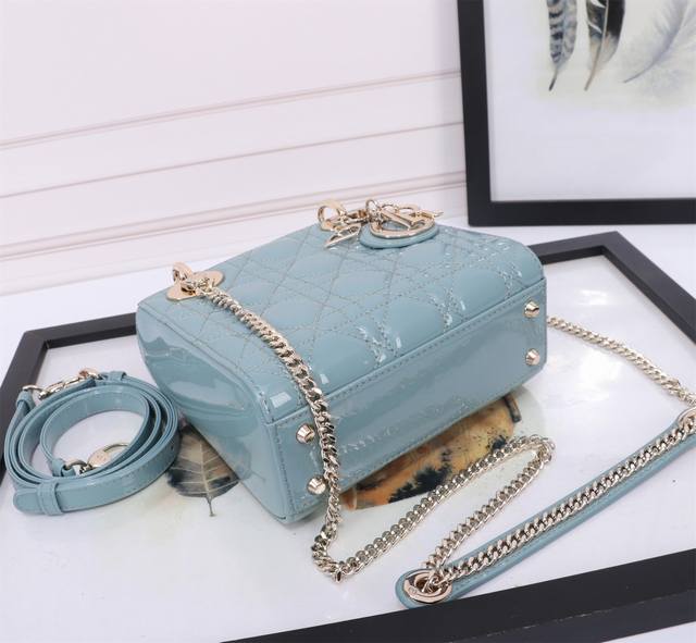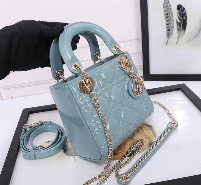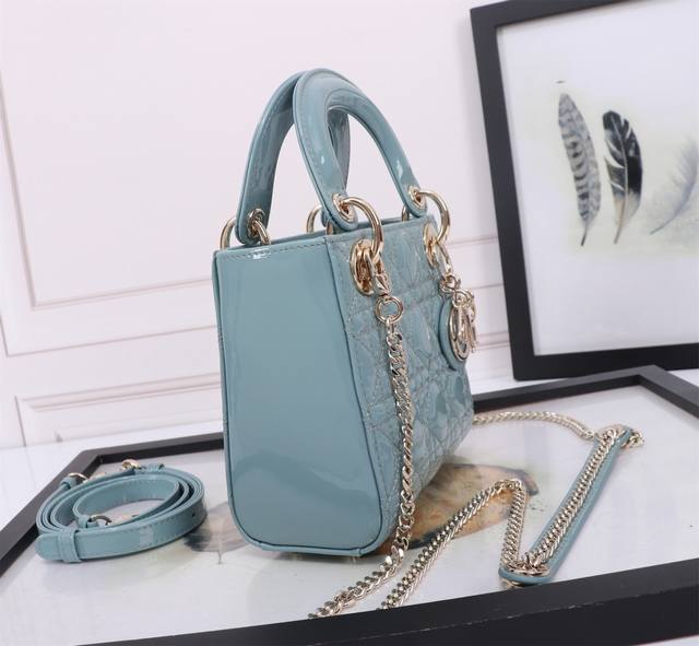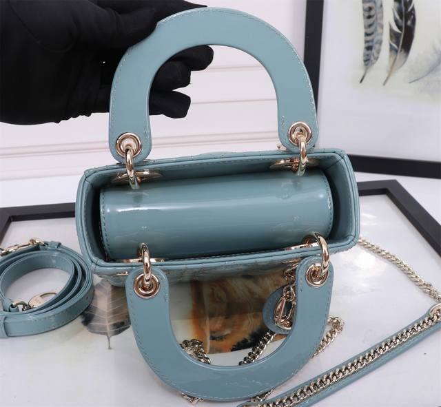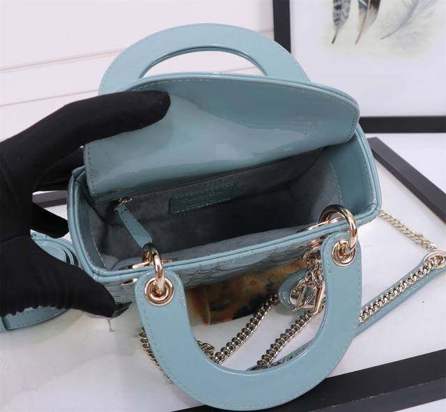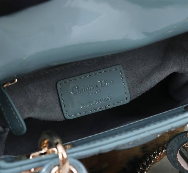 藤格纹漆皮牛皮革迷你手袋,Cannage藤格纹缝线装饰,搭配链带和金属配饰。 可拆卸长链带,可手提亦可肩背或斜挎。