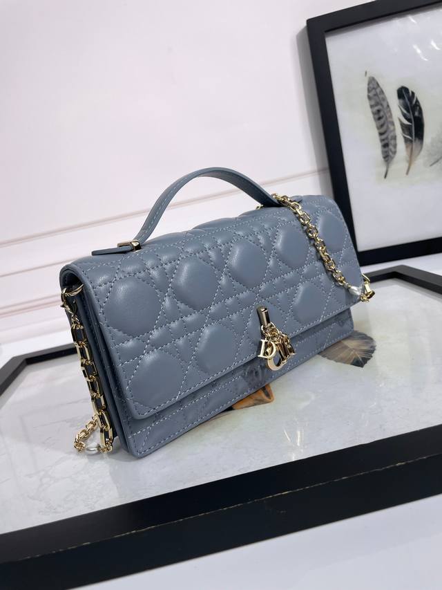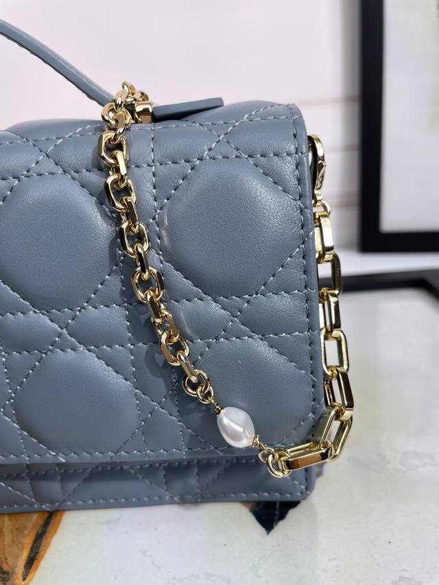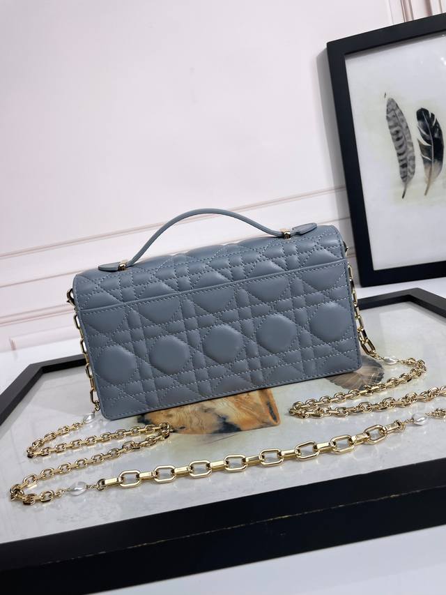 这款 My Dior 迷你手袋优雅实用,进一步丰富了此系列。采用胭脂粉色羊皮革精心制作,饰以藤格纹,正面搭配翻盖设计和 D.I.O.R. 吊饰提升格调。款式实用,设有多个隔层和卡槽,可收纳各种日常用品,是日装和晚装的理想良伴。搭配顶部手柄和饰以树脂珠饰的可拆卸链条,可手提或斜挎。