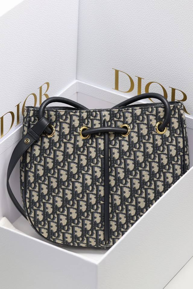 Dior新品包,帆布配皮制作,饰以平纹硬挺的顶部手柄搭配复古金色饰面金属装饰,点缀以滑动式D.I.O.R.掉饰,增添了灵动之感,中号款式,抽绳开合,实用的内部设有一个插袋,搭配可调节.可拆卸的皮革肩带,可手提,肩背或斜跨。