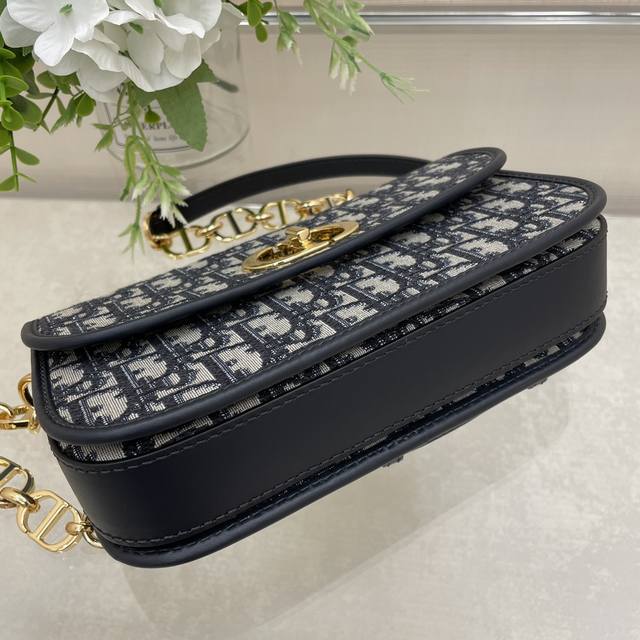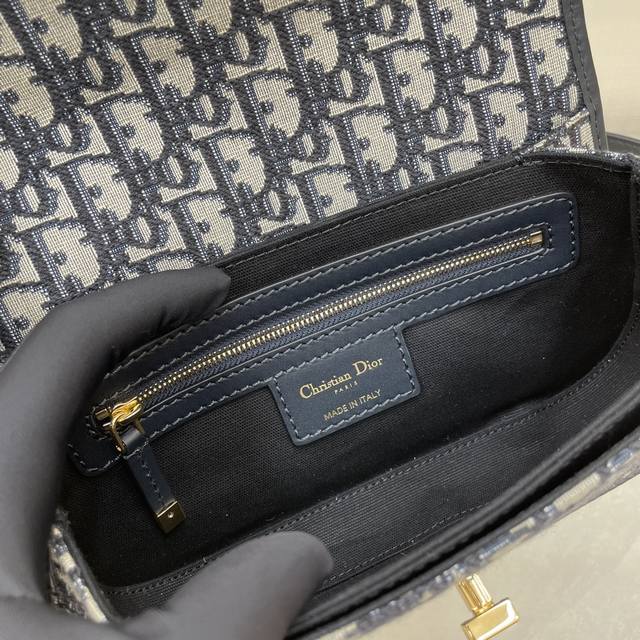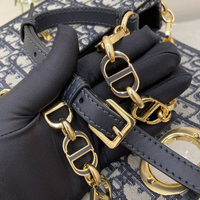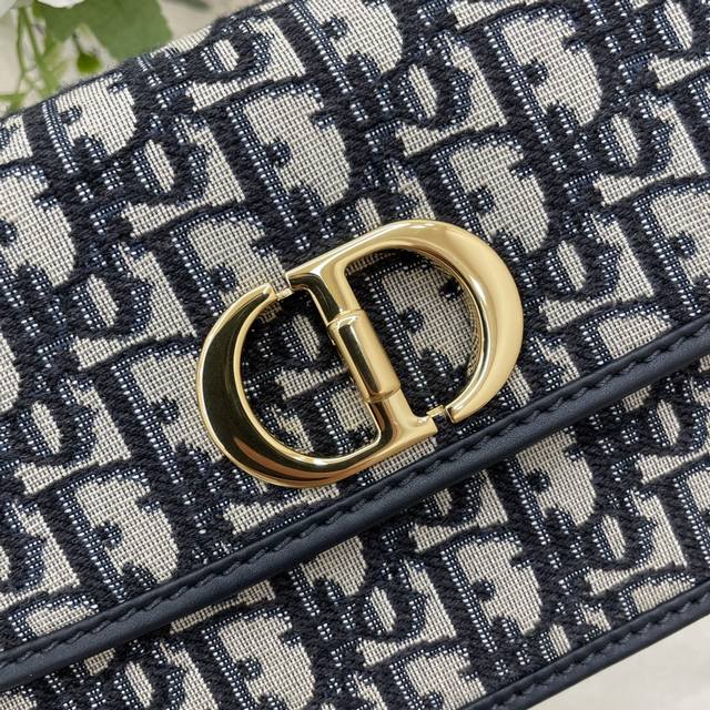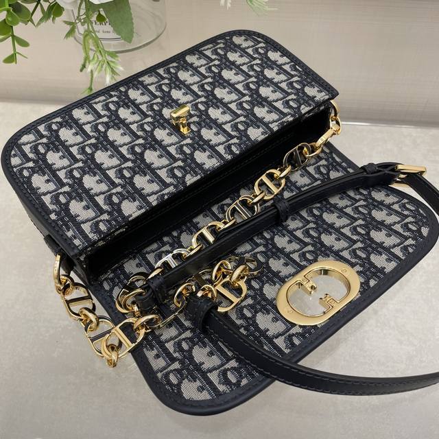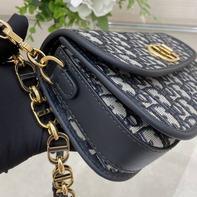 手袋采用典雅的设计,提升此经典系列的格调。采用蓝色 Oblique 印花面料精心制作,圆角翻盖曲线精致,饰以复古金色饰面金属 Cd 扣环,灵感源自 Christian Dior 香水瓶的封口。背面饰以压花 30 Montaigne 标志,搭配由金色饰面金属和与皮革同色调的珐琅链环交替组成的经典链条。褶层设计,空间宽敞,廓形精致,可手提、肩背或斜挎。