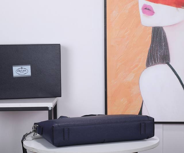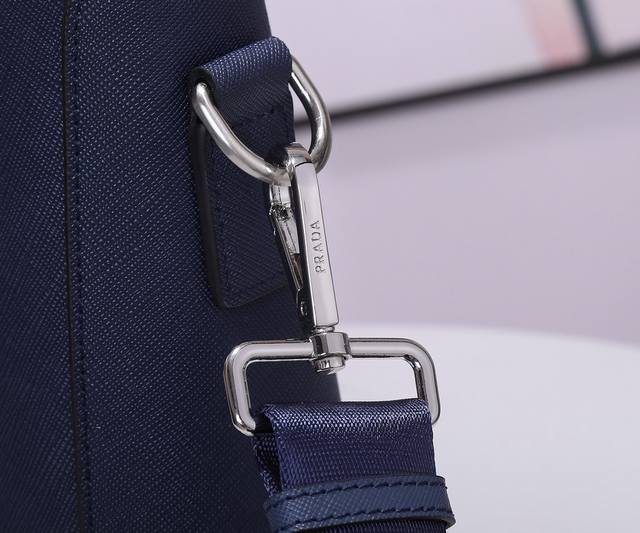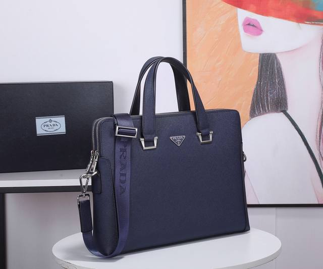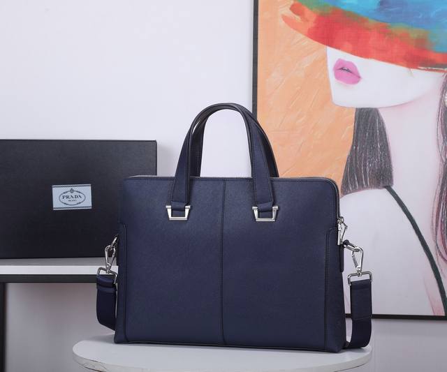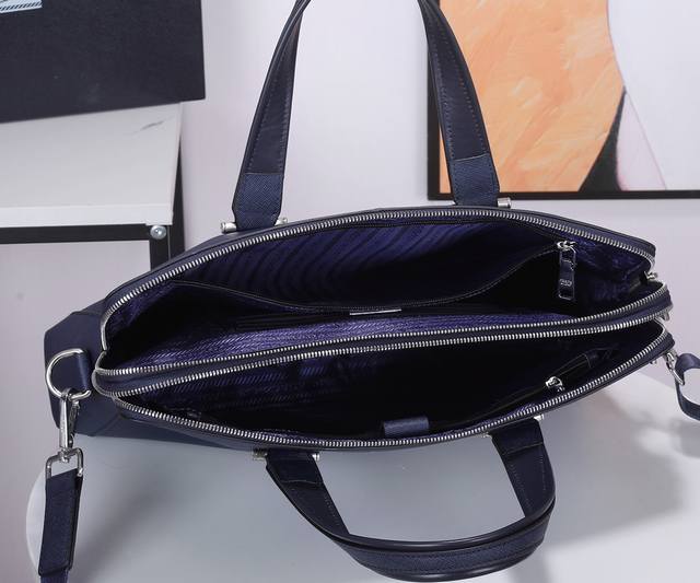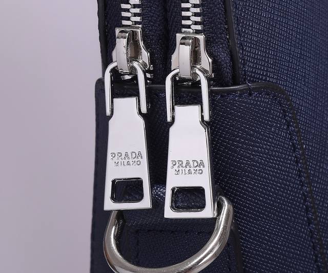 Prada最新爆款原版皮型号:81189-1 双拉链 专柜私货男士公文包 原厂私货品质 ! 代工码+意大利产地标。十字纹牛皮 !原厂五金Logo!工一流 高端走起,男神必备 !无懈可击!实物实拍黑色、蓝色!尺寸:W38.5 H28 D6Cm