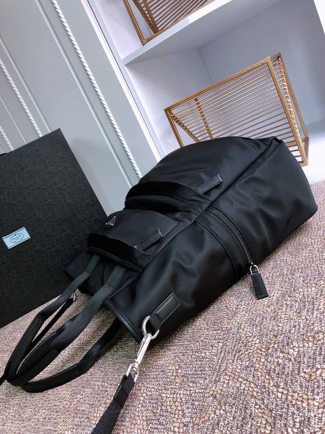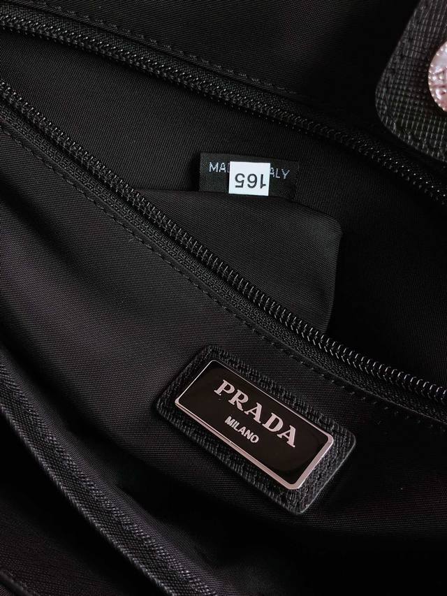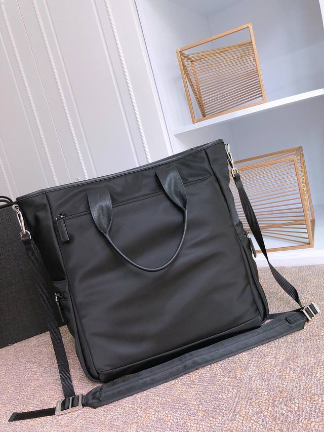 独家首发1Bg040,原单货采用进口尼龙布料,内部徽标牌和正面三角形搪瓷徽标 金属配件和D形环 可拆可调式织物面料肩带 尼龙衬里 两个正面口袋,一个背面口袋和两个侧袋 均带拉链 两个侧壁缝合内袋 手提带 带Saffiano皮革饰边的编织织物提手,轻便又实用,男士们最爱,长38乂高33X底15Cm.