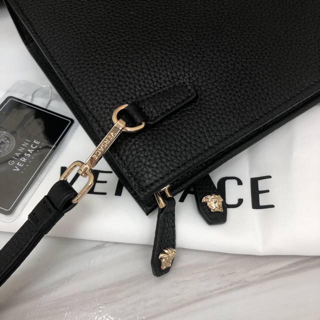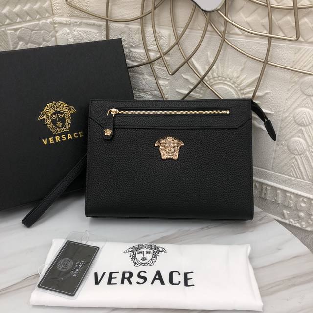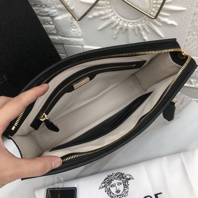 款号7Va564黑色丝印手包,设有内部隔层,配拉链开合,卡夹和可拆卸织带手镯式手柄。尺寸:27Cm-18Cm-5Cm