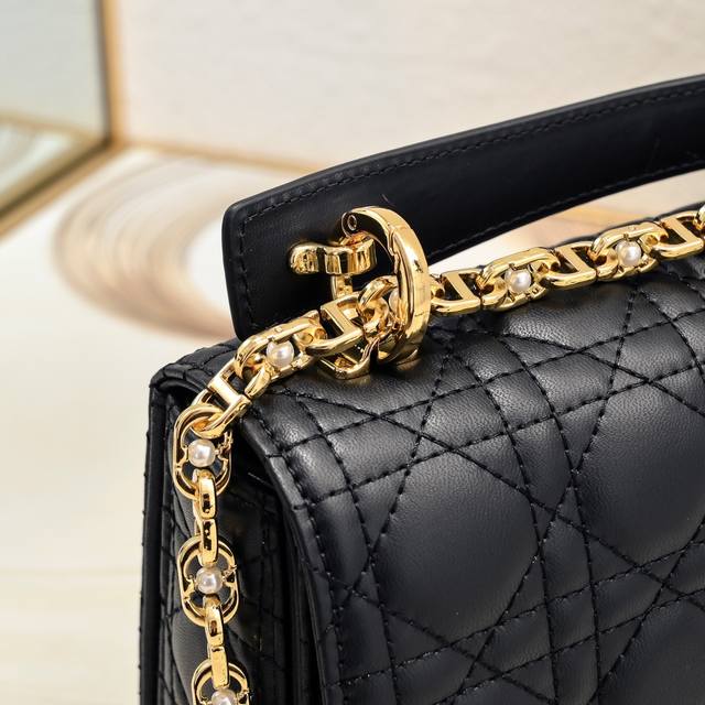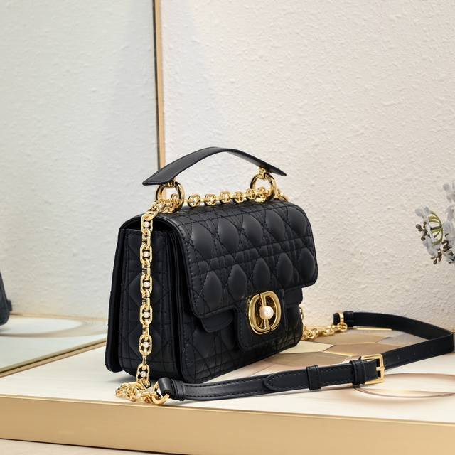 这款Dior Jolie 手提包是二零二四春夏成衣系列新品,兼具优雅气质与实用功能。采用白色牛皮革精心制作,饰以藤格纹缉面线,双重翻盖饰以Cd 标志提升格调,点缀以白色树脂珠饰,三隔层和拉链口袋可收纳各种日常用品,可与日常或晚装造型搭配。小号款式,搭配可拆卸手柄与可拆卸链条肩带,肩带由皮革带和 Cd 标志链环组成,饰以白色树脂珠饰,可舒适手提[6]