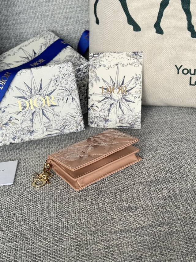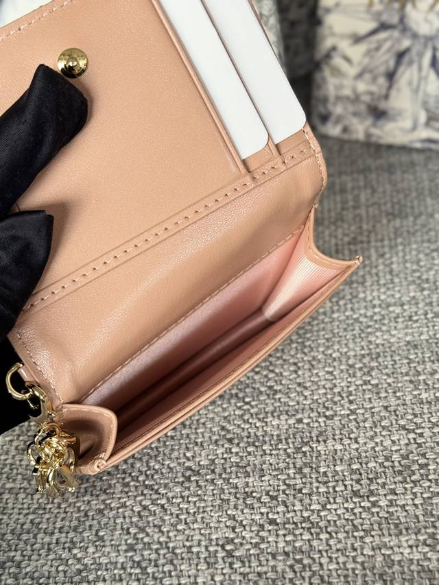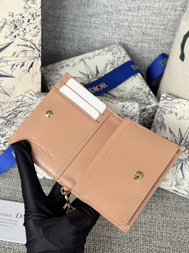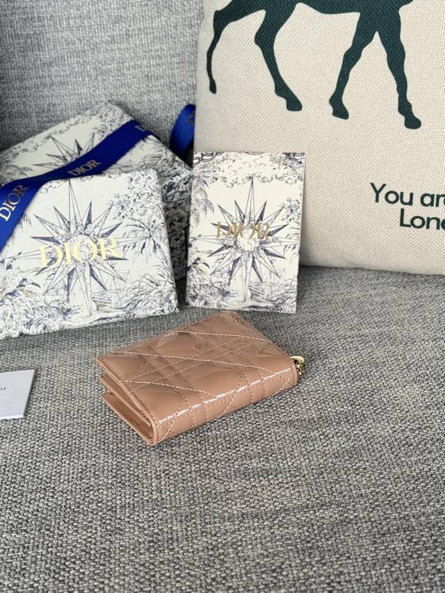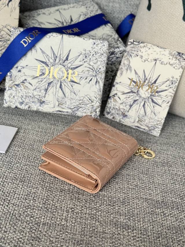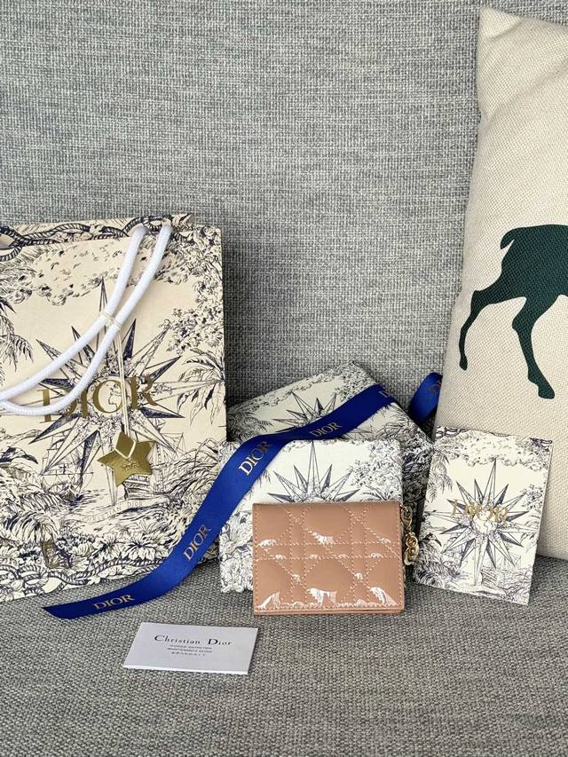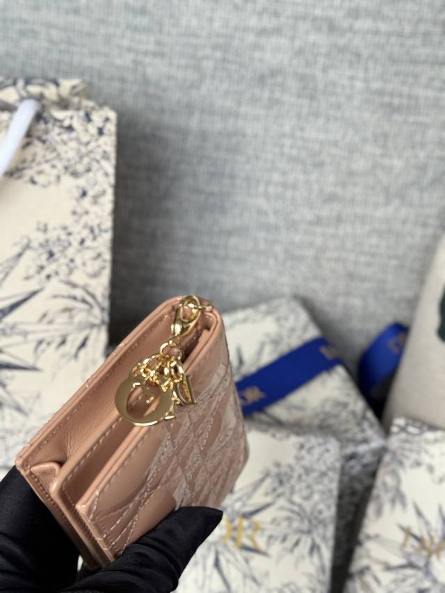 / 迪奥翻盖卡夹 编号:S0011 漆皮牛皮+内里羊皮精心制作,彰显 Lady Dior 系列标志性设计 搭配藤格纹缉面线和“D.I.O.R.”吊饰。实用而精巧。尺