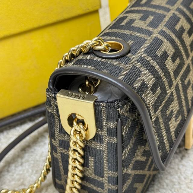 标志性Baguette中号链带手袋。 提花布料材质,饰有棕色标志性Ff图案和棕色小牛皮饰面,搭配Ff搭扣。 设有正面翻盖、磁扣、一个带同色调标志性Ff提花布料的带衬内隔层,搭配一个拉链袋和金色饰面金属件。 配备滑链肩带,可肩背或斜挎。