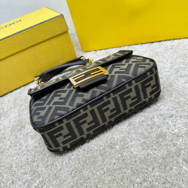 标志性Baguette中号链带手袋。 提花布料材质,饰有棕色标志性Ff图案和棕色小牛皮饰面,搭配Ff搭扣。 设有正面翻盖、磁扣、一个带同色调标志性Ff提花布料的