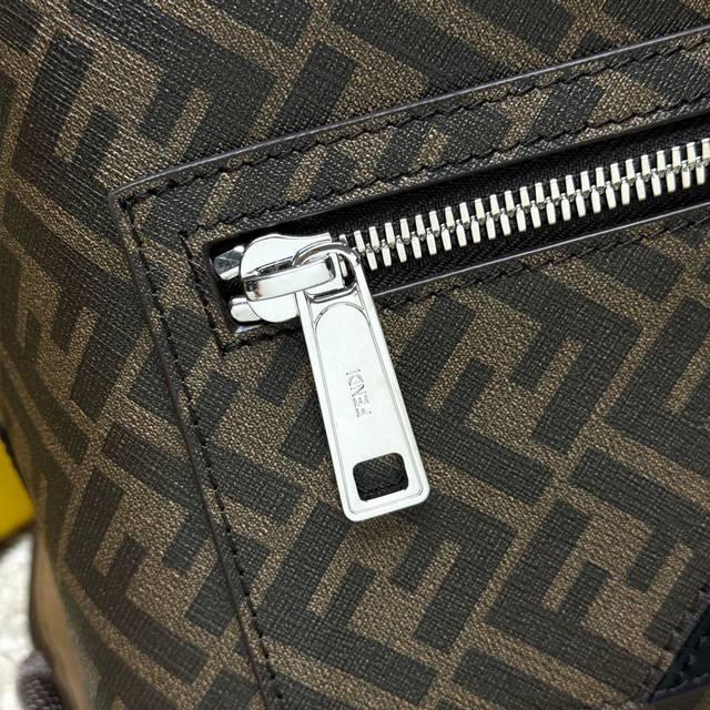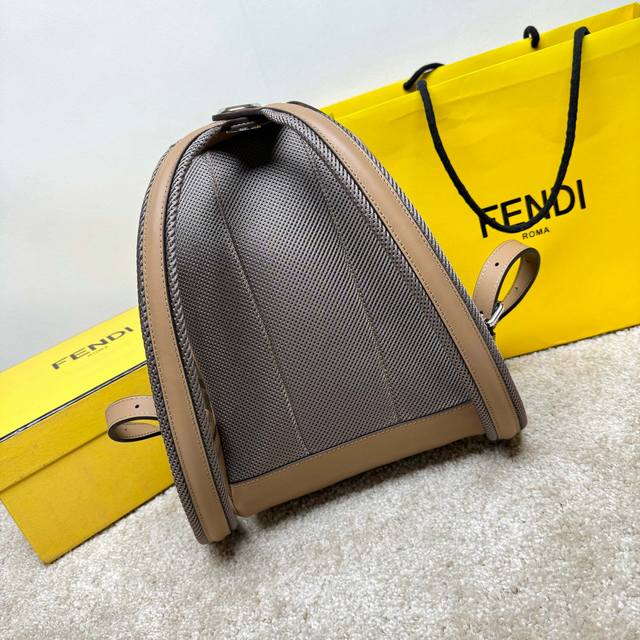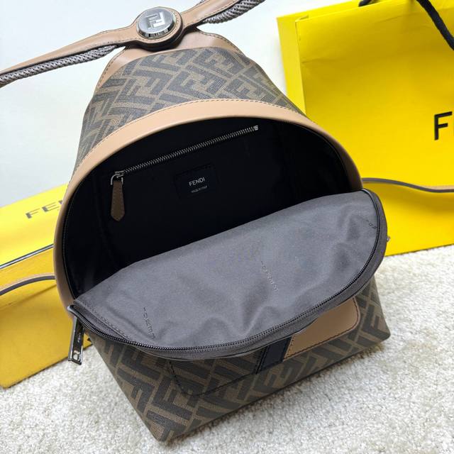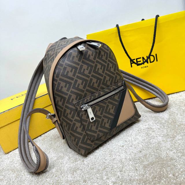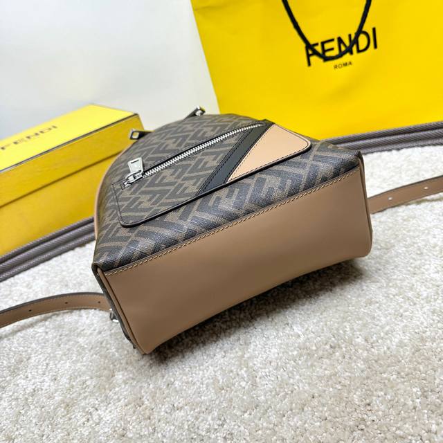 / 小号立体结构双肩背包。此款设计带有一个镌刻Ff标志的金属铆钉,可以让两条肩带变一条,变身为单肩款式。棕色Ff帆布材质,带米色皮革细节。正面拉链口袋饰有皮革斜纹嵌