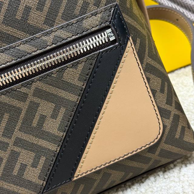 小号立体结构双肩背包。此款设计带有一个镌刻Ff标志的金属铆钉,可以让两条肩带变一条,变身为单肩款式。棕色Ff帆布材质,带米色皮革细节。正面拉链口袋饰有皮革斜纹嵌饰。带双向拉链隔层、内部拉链口袋和银色金属件。带滑动调节的肩带,让这款手袋可单肩背或双肩背。