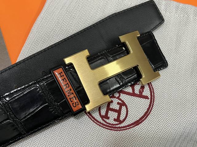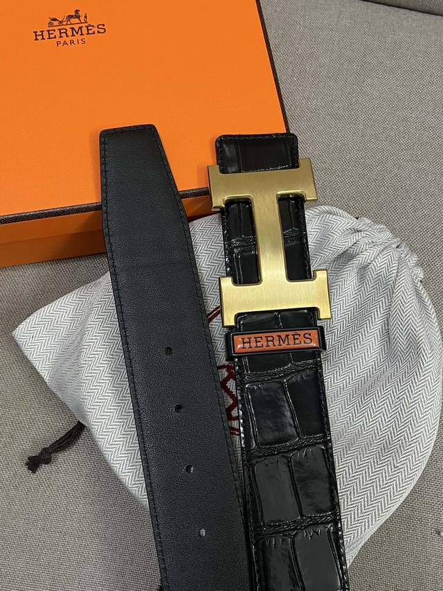 / Hermes .爱马仕 鳄鱼皮纹 男士真皮腰带 宽度3.8Cm 带身采用进口原版头层牛皮 鳄鱼纹面皮搭配小牛皮底皮 配搭精品钢扣 可双面使用 触感厚实 全套包装
