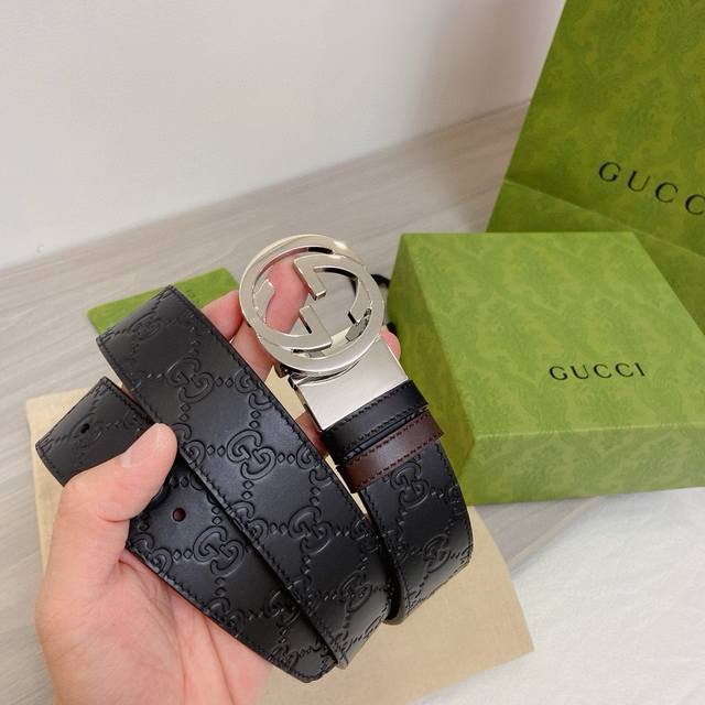 / Cucci 正版开模 此款腰带采用原版Gg牛皮内侧有单色平纹牛皮 双面可用 精密电镀标志性旋转五金搭扣 对版专柜足宽38Mm 人手必备 双面用