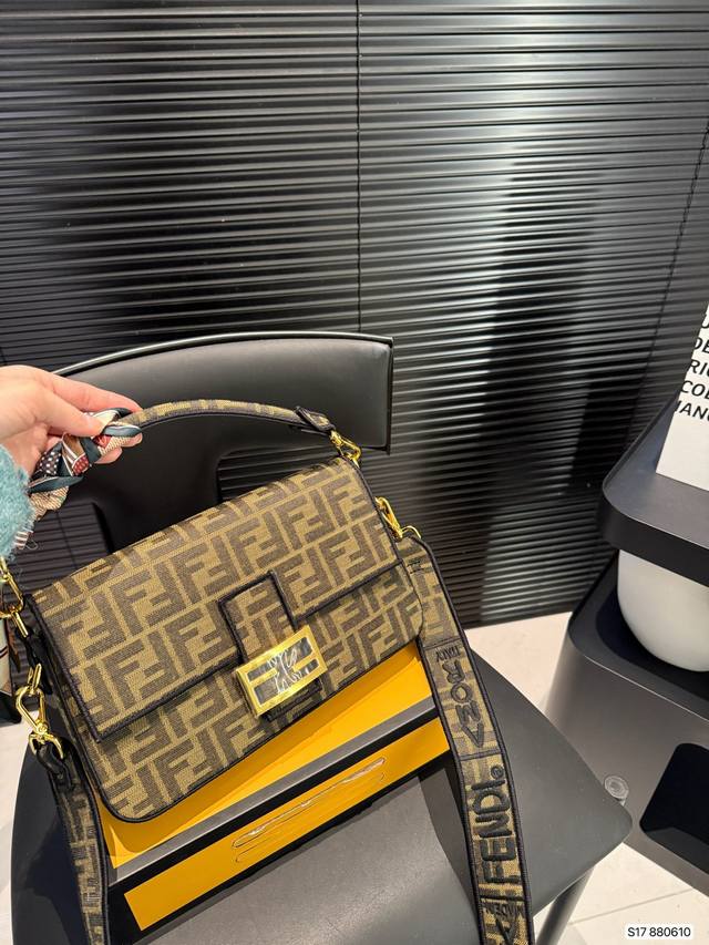 Fendi Baguette芬迪法棍包第一眼就觉得砸中了我。加上中号有一根较长的肩带,非常实用。装两个手机,钱包,钥匙,墨镜,口红,粉饼都毫无压力。看起来虽然不算太大但是绝对很能装。尺寸26 15 货号880610