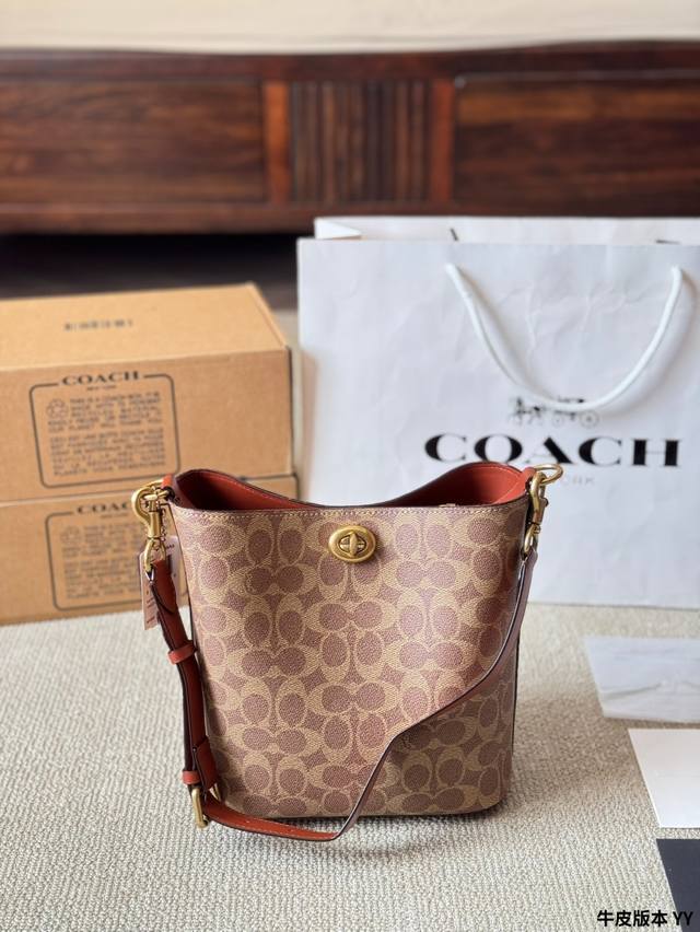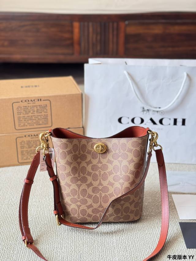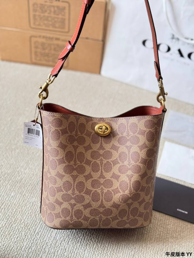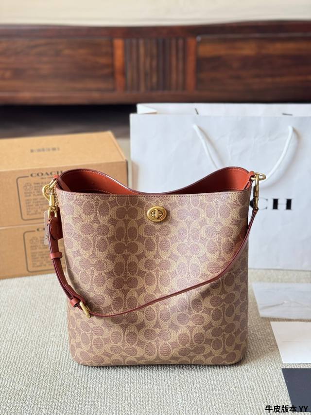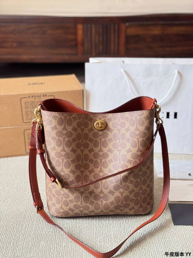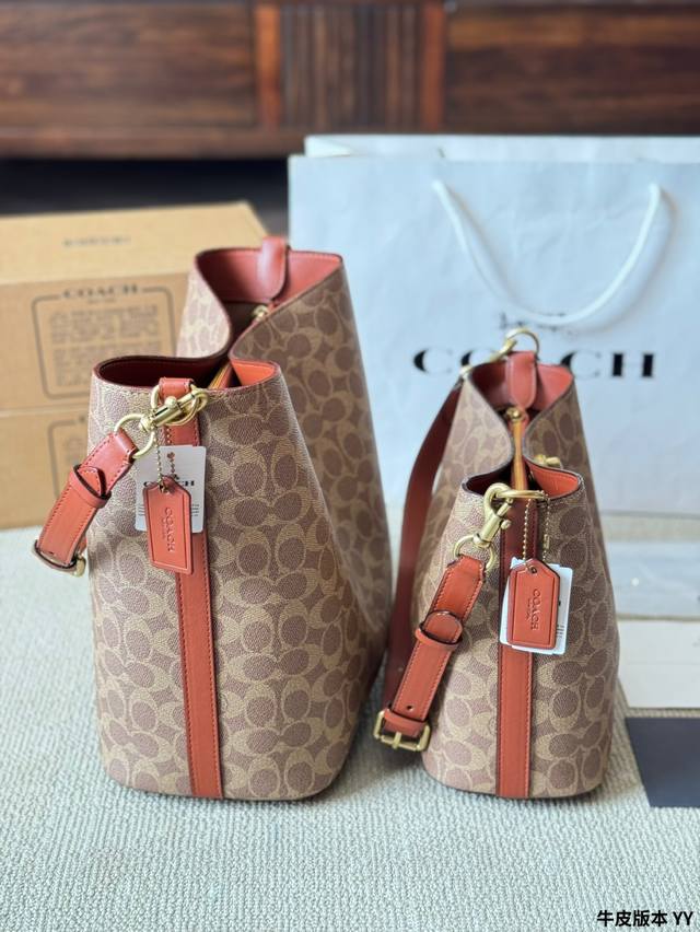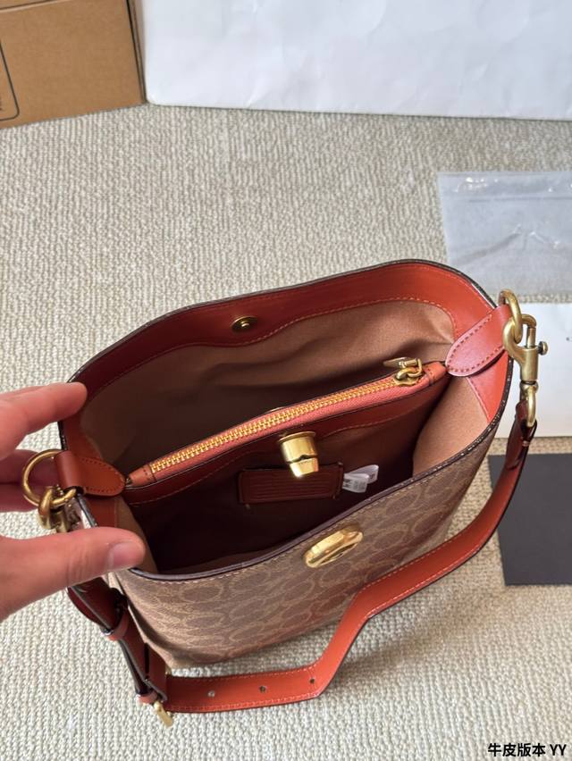 采用拋光鹅软石纹皮革制作,并井有条的内部空间包含一个拉链隔层、两个开放式隔层以及一个小型所需物品口袋。流线型的水桶包造型带有安全的经典标志旋锁扣件,既可手提,也可肩背或斜挎。 尺寸大号25 20Cm 小号20 22Cm