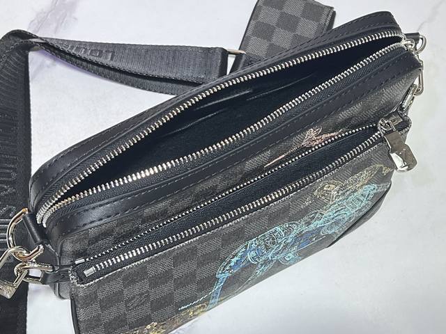 批200M57840 M30848 M50068 M20665 M69443 M45320 新款Trio 邮差包由 Monogram Eclipse 帆布与 Monogram Eclipse Reverse 帆布制成。标志性的同色调灰色图案凸显此多功能拼搭设计品的线条。除具备传统斜跨手袋的功能外,另配可脱卸拉链袋和附于包带上的零钱包。小包:12×7 Cm中包:24×15 Cm大包:26×5×18 Cm