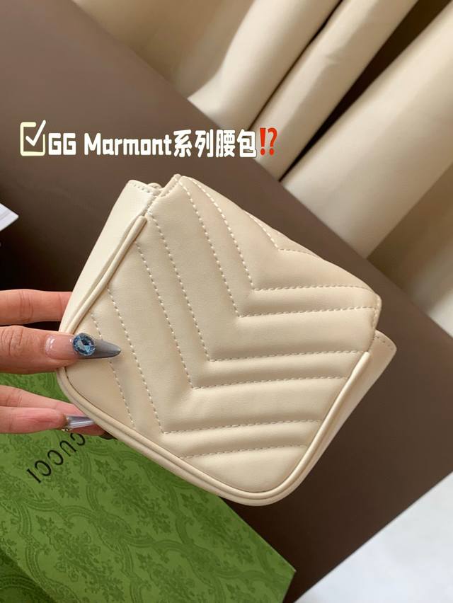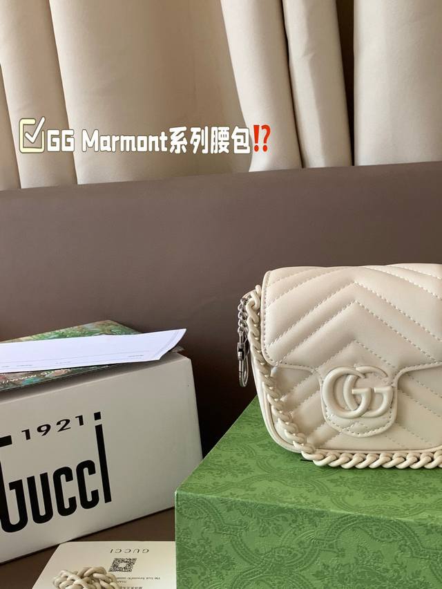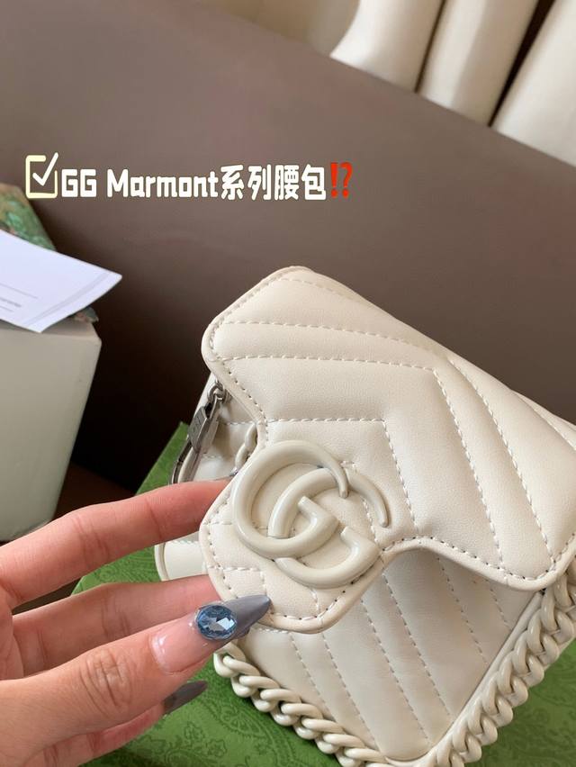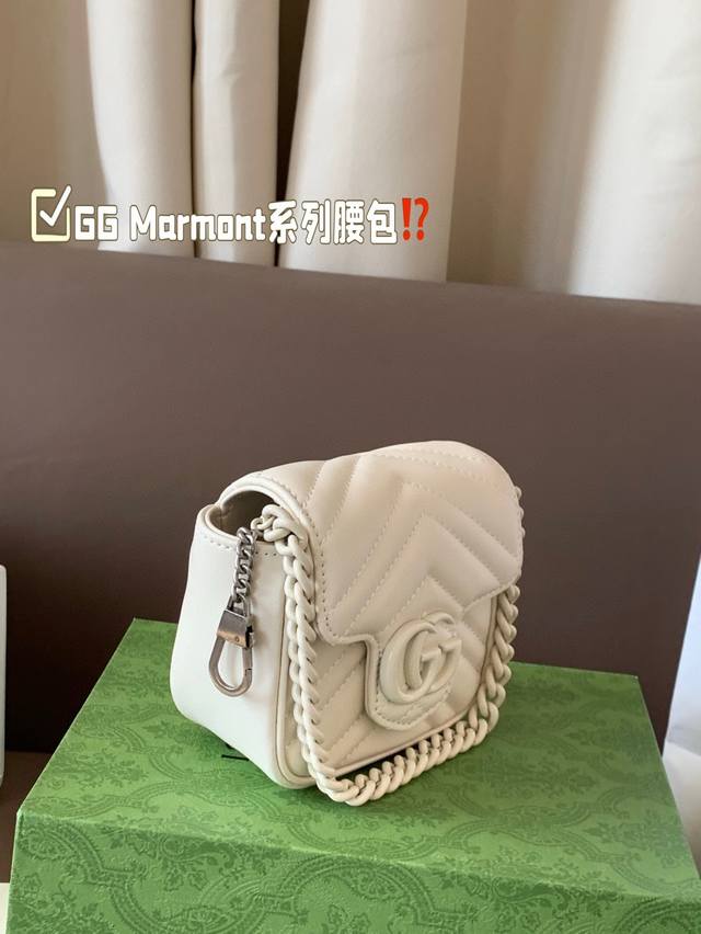 gucci宠儿精选Gg Marmont系列手袋刚刚上架-组新包型,迷你腰包采用V型绗缝皮革搭配陶瓷效果饰面五金件,金属链带可系于腰间或挎在肩上,演绎多变造型。