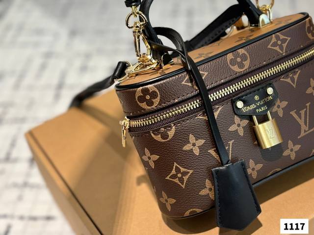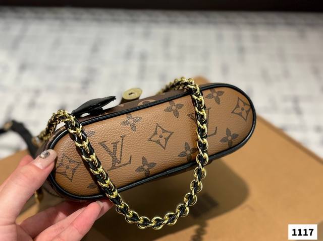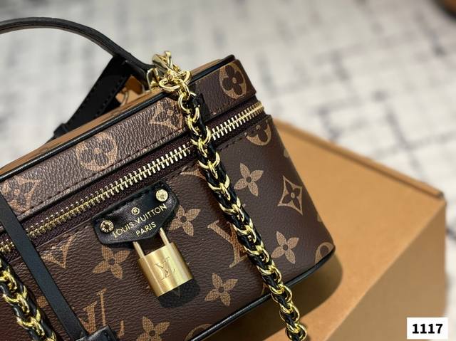 vanity Chain Pouch 手袋以经典化妆箱为灵感,同样采用 Monogram 和 Monogram Reverse 帆布拼色设计,可拆卸编织链条融入皮革细节,与金色 Lv铭文挂锁相