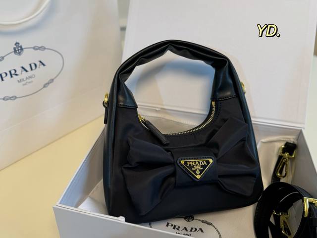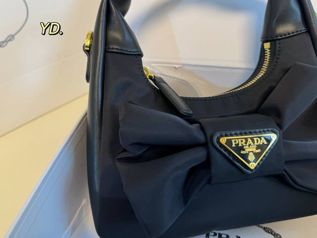 p160(折叠盒) size:21×10 prada普拉达新款蝴蝶结手提腋下包 包型简约大气,优雅甜美复古 配有长肩带,可手提可斜挎~ 尼龙拼皮面料 高端大气上