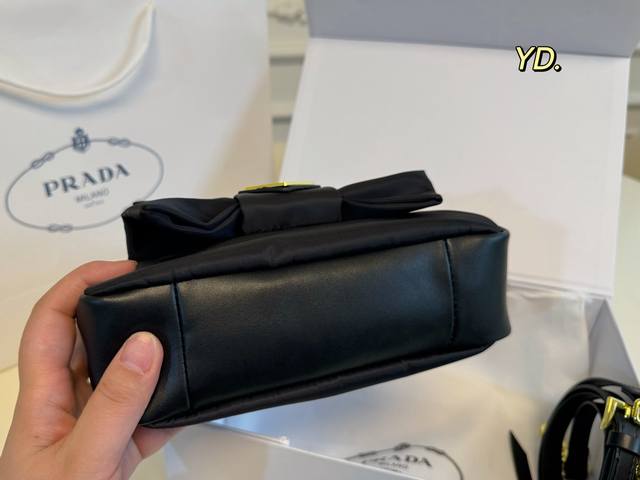 / p160(折叠盒) size:21×10 prada普拉达新款蝴蝶结手提腋下包 包型简约大气,优雅甜美复古 配有长肩带,可手提可斜挎~ 尼龙拼皮面料 高端大气上