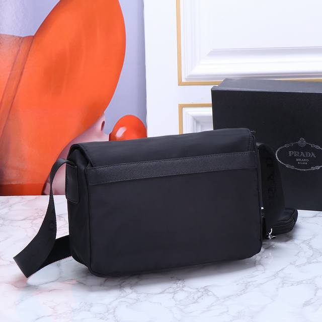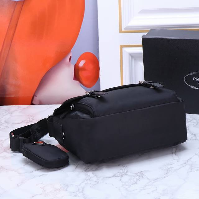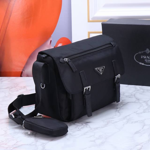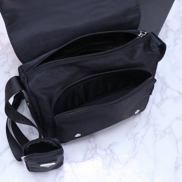 这邮差包点缀有Saffiano皮革细节。饰有徽标和钢配件三角标元素,配有可调式织物肩带,肩带上配有可拆卸的小包,实在太爱了容量空间非常大,上身效果非常棒,赶紧入手吧又是一款永久不过时爆款。尺寸:30 X 25 X 12,型号67856