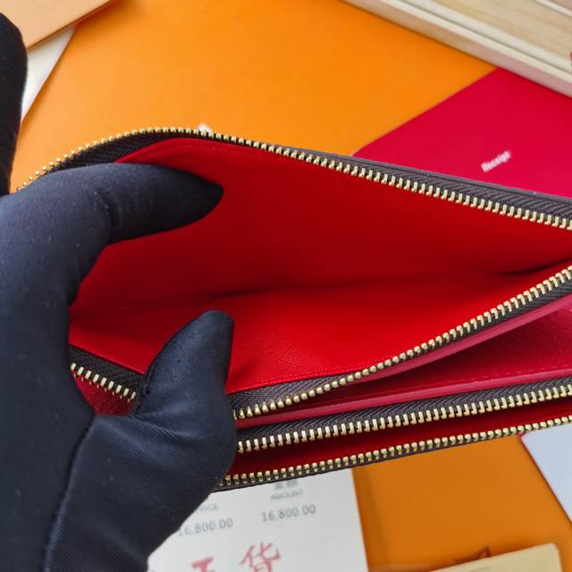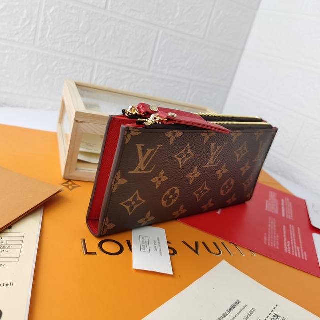 p130M61269大红超级实用款,依然火爆!官网同步款!将Louis Vuitton的经典Monogram帆布材质与亮彩色Leather内衬综合在一起,时尚的Adele钱夹具备现代的薄型设计、两个皮革拉链还有一个磁扣,便于打开。它还可作为手包使用。12个信用卡槽,2个可装零钱或智能手机的拉链隔层,2个扁平内袋,压纹牛皮内衬,闪亮的金色部件。尺寸:21.9.2