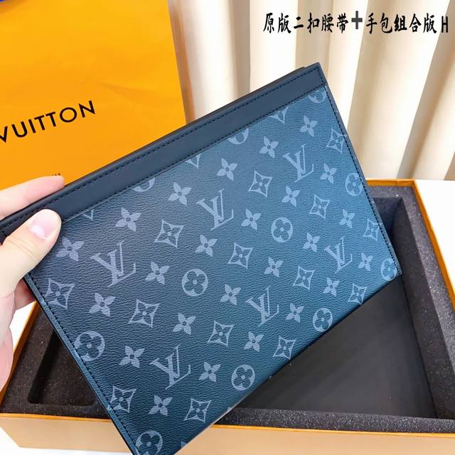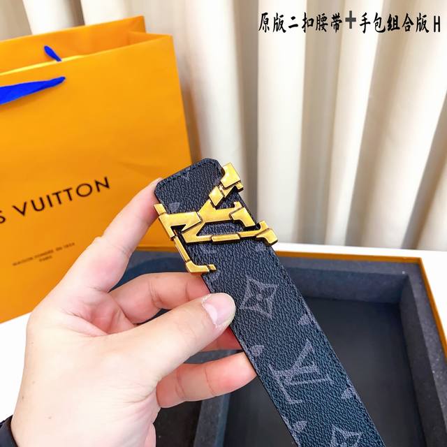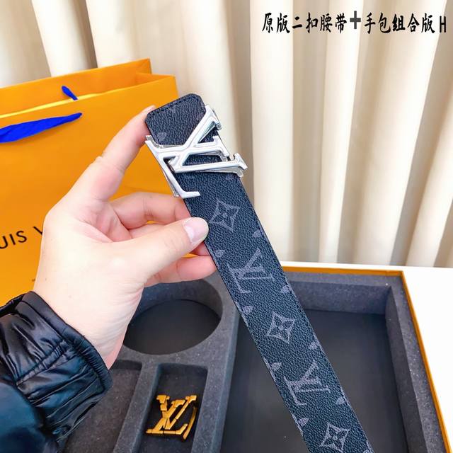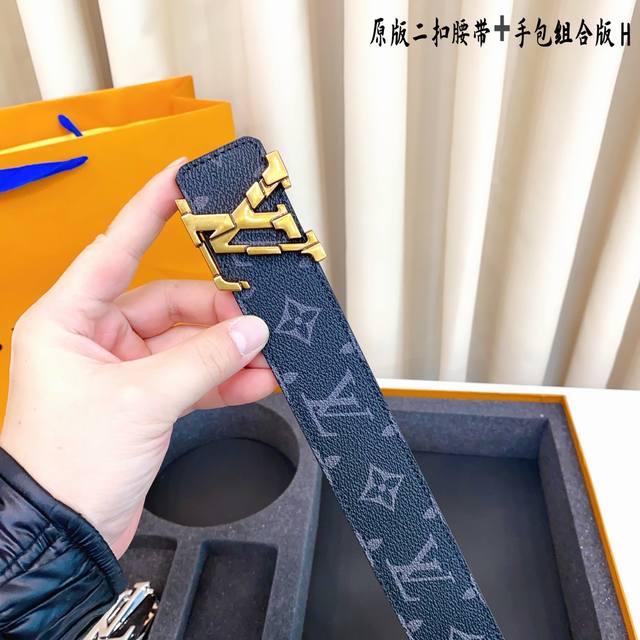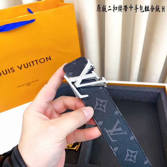 p270 腰带双扣手包4件套路易L家 腰带采用原版皮牛皮带身,带宽3.8Cm。2扣头采用原版五金扣头。原版手包原版复刻。尺寸:26*20独家定制4件套高端包装。