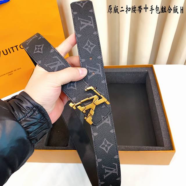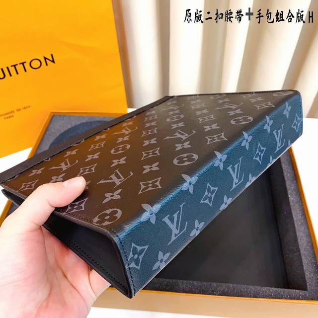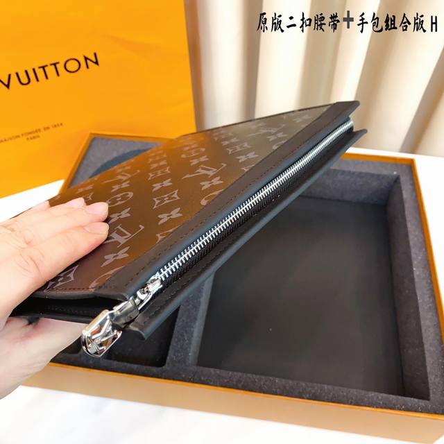 / p270 腰带双扣手包4件套路易L家 腰带采用原版皮牛皮带身,带宽3.8Cm。2扣头采用原版五金扣头。原版手包原版复刻。尺寸:26*20独家定制4件套高端包装。