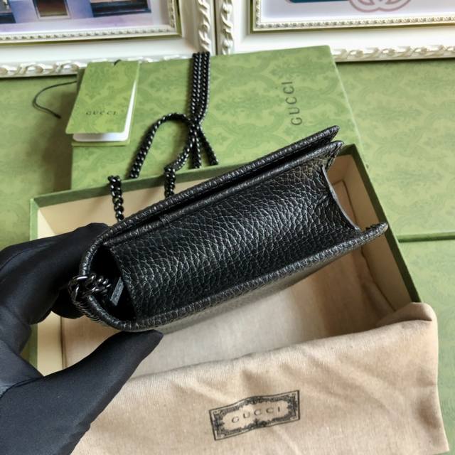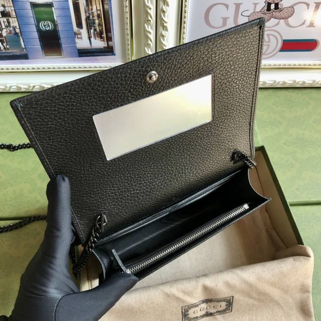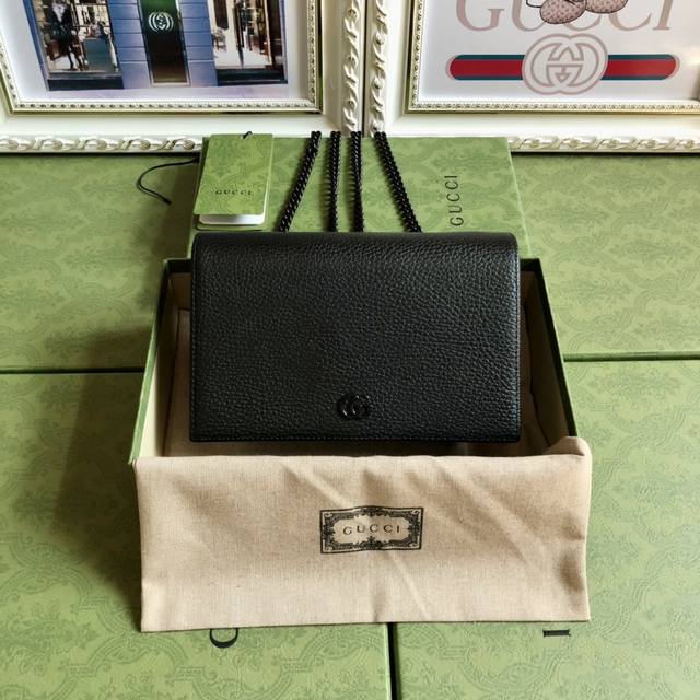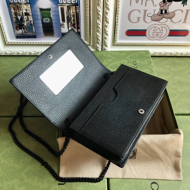 顶配版 G家新款小双G金属链单肩包完美搭配 内部空间充裕+化妆镜面!专柜品质!顶级意大利进口牛皮 !黑色金属配件 做工精细 !款号:497985!尺寸:20X12.5X4.5Cm 颜色:全皮/黑色