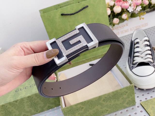 全套包装古奇 寸5 材质:客供自然摔纹胎牛皮,黑色配咖啡,全粒面皮料,皮料非常柔软,喜欢软皮的入这款皮带绝对不会失望。 扣头:纯钢扣 金色 银色 。码数:100-125Cm 包装:高档礼盒包装