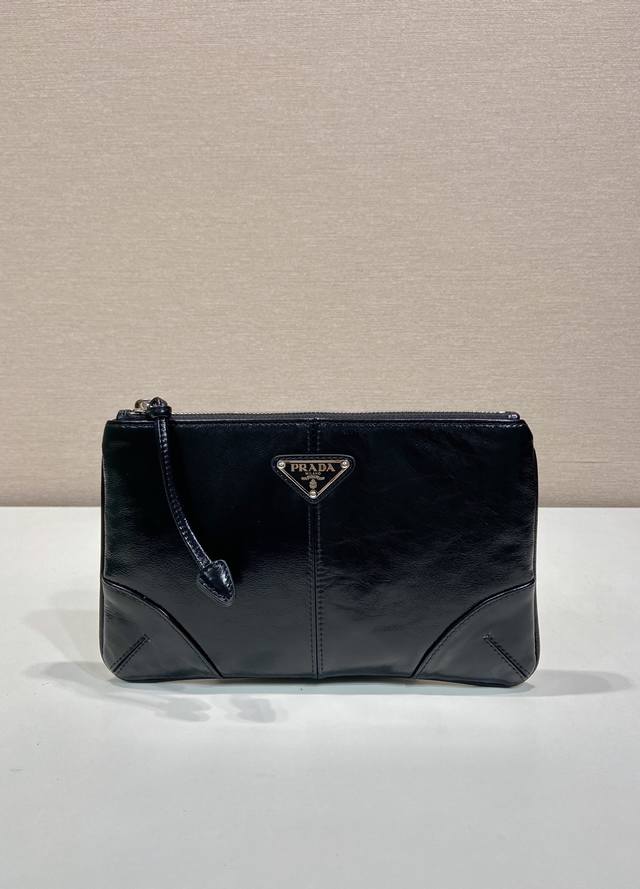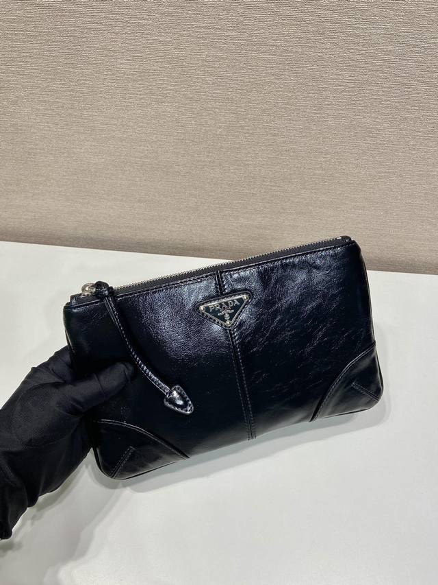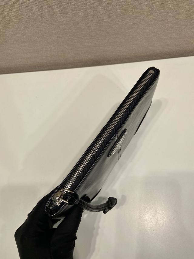 油腊皮手包2Nh006S小号油腊手包,原单货采用进口油腊皮革材质,袋口拉链开合,抛光不锈钢金属五金配件,内部徽标,外部三角形徽标,兼具实用性和别致设计风格,显得