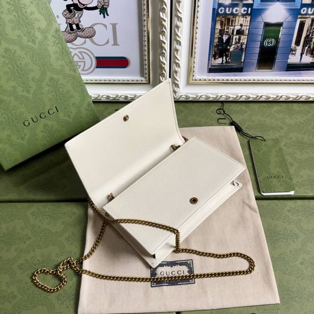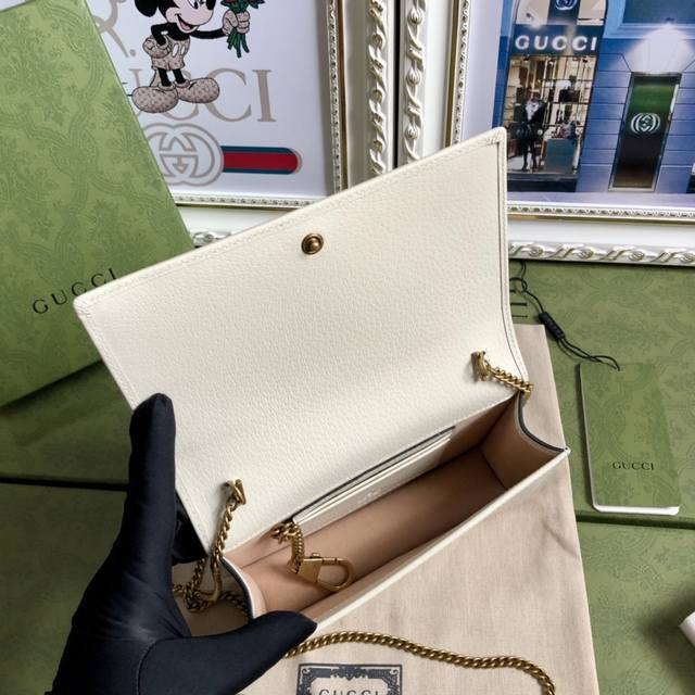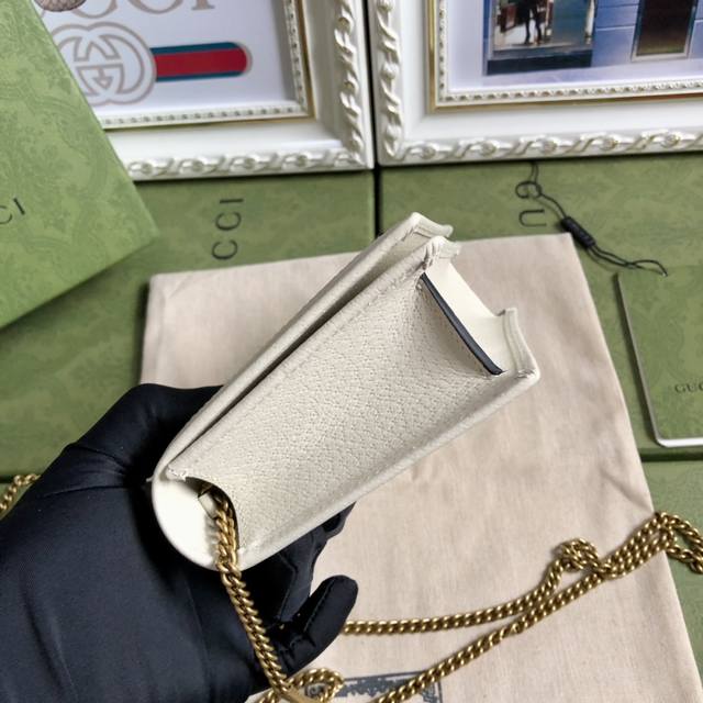 顶配版 Gg手袋采用黑色皮革材质,造型纤巧,别具匠心地将同系列手袋的经典竹节提手呈现为正面的精巧细节。黑色皮革,古金色调配件,绒面材质质感云纹织物和超细纤维混纺衬里,2个卡片隔层,1个钩扣,按扣开合。型号:696817。尺寸:19X 11X 5。颜色:白色 全皮。