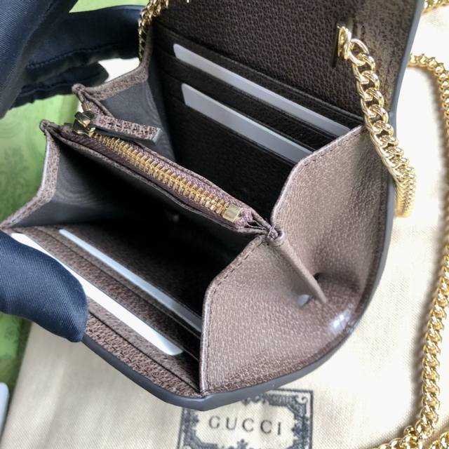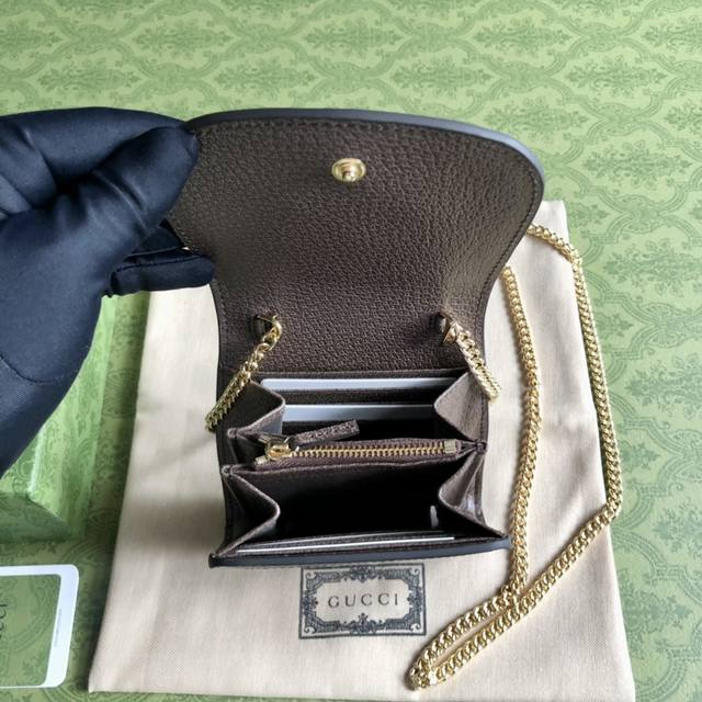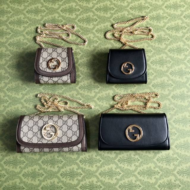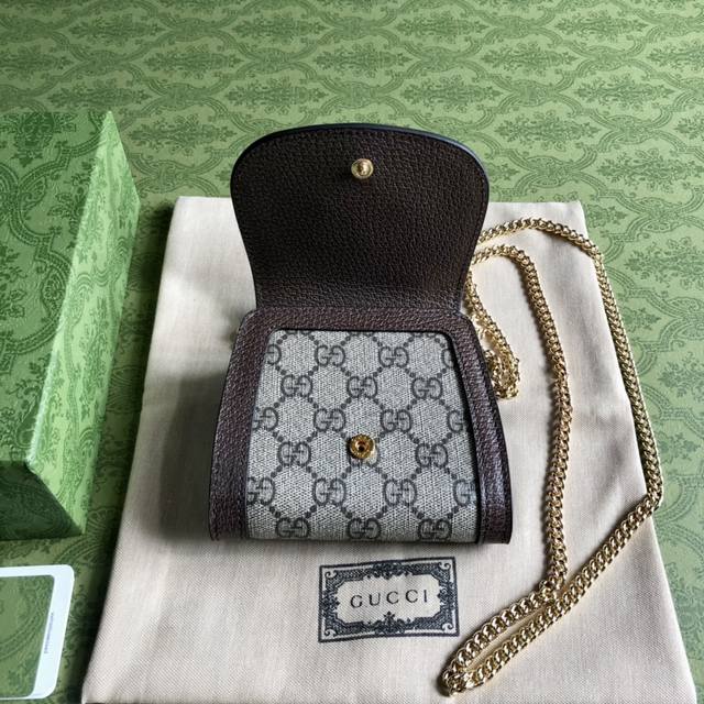 / 顶配版 品牌典藏元素以几何造型焕新演绎互扣式双G标识,呈现多款全新小皮件单品。金色调配件为这款链带钱包注入精致复古气息,与米色和乌木色Gg Supreme帆布交