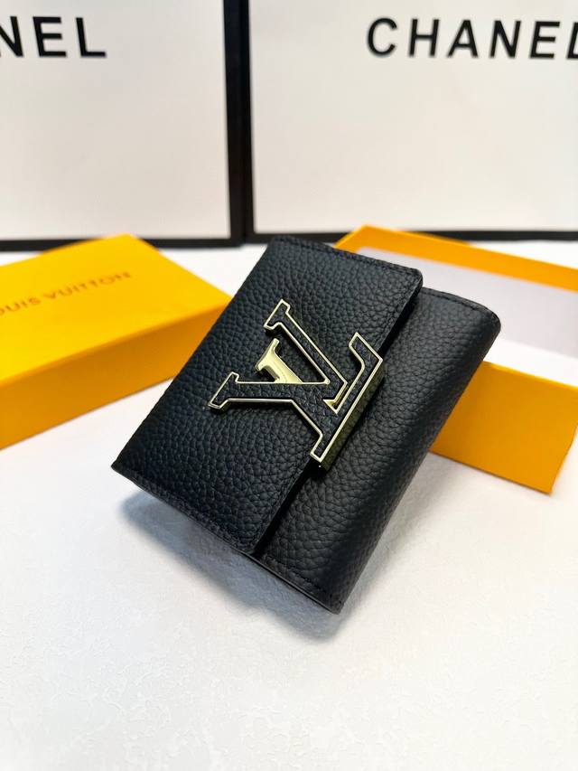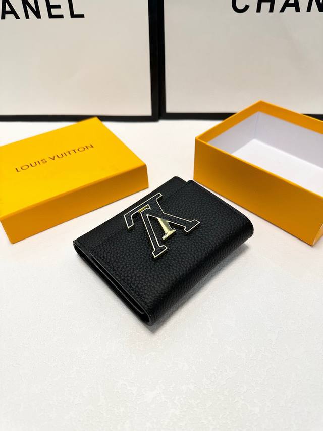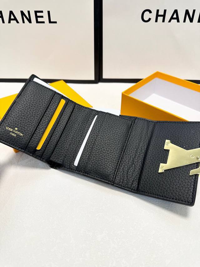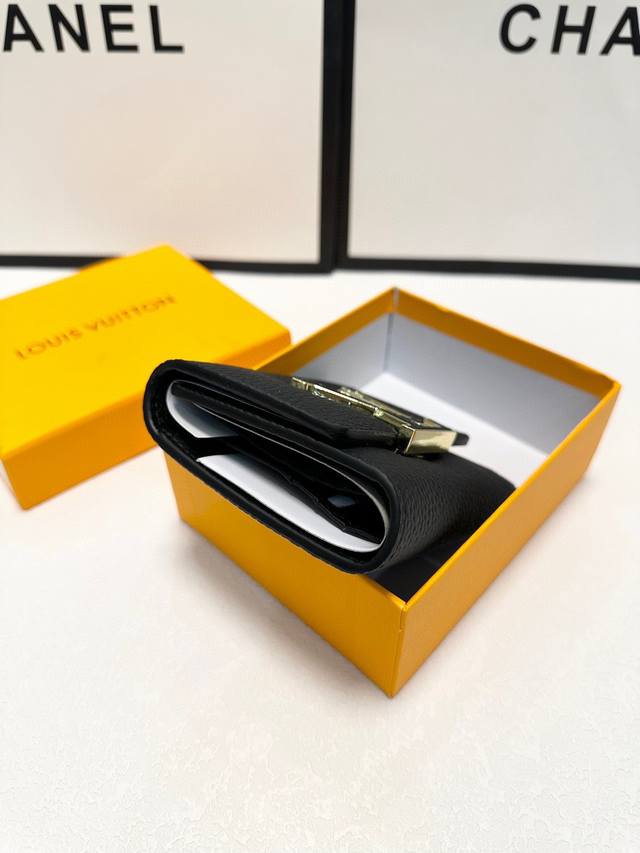 / 颜色 黑色尺寸 11X10Lv 短款钱夹小牛皮融合重译系列密码 钩扣镶缀于翻盖之上,将充裕内里和多个实用设计隐藏其下,内含一个拉链零钱袋及多个卡位