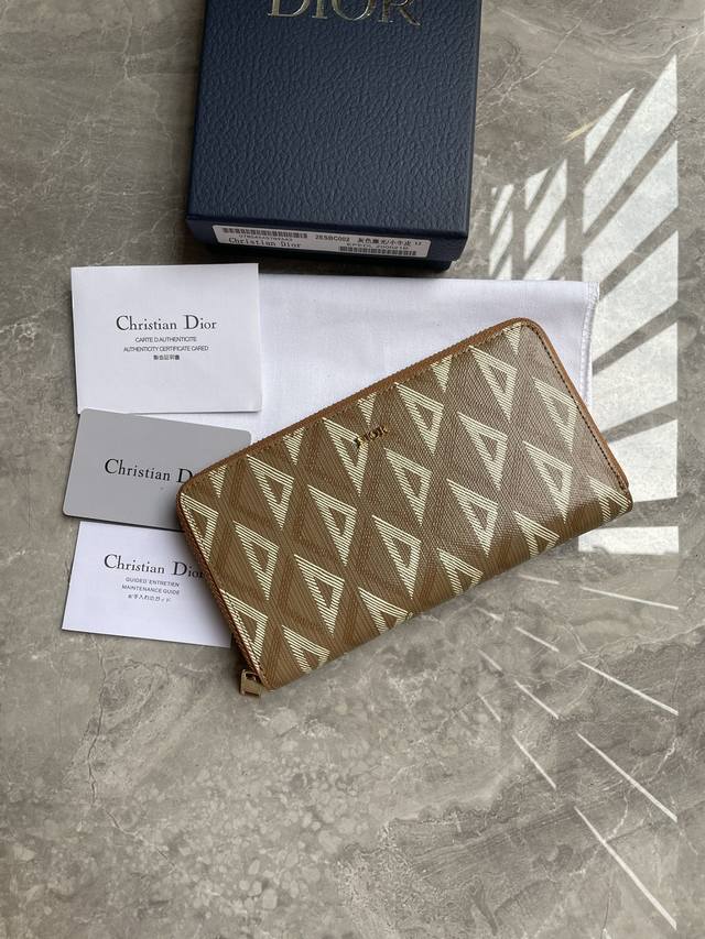 Di0R 棕色帆布Cd Diamond图案,棕色光滑牛皮中间的拉链隔层可放置硬币,两个现金隔层和12个卡位提供充足的收纳空间。长款拉链式钱包,优雅宽敞,是日常的理想良伴。型号2Esbc252尺寸19X11Cm 629工厂P代码