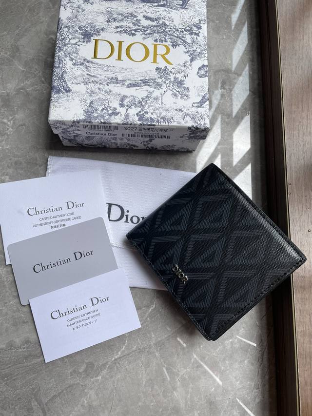 Dior 男士短款钱夹,采用黑色Cd Diamond 图案光滑牛皮,双折款式,搭配黑色头层牛皮,内置1个双层现金隔层,2个票据隔层和8个卡槽非常实用,内含防尘袋,款号027尺寸11.×9.5Cm