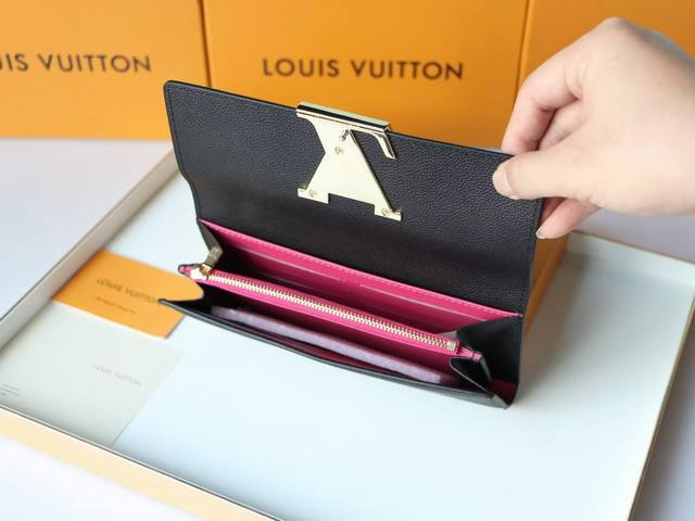 颜色 黑 粉 卡其尺寸 20X11型号M61248 缀以皮革覆面 Lv标志,这款优雅钱包的设计灵感来自经典Capucines系列,时尚而实用,并且足以容纳所有日