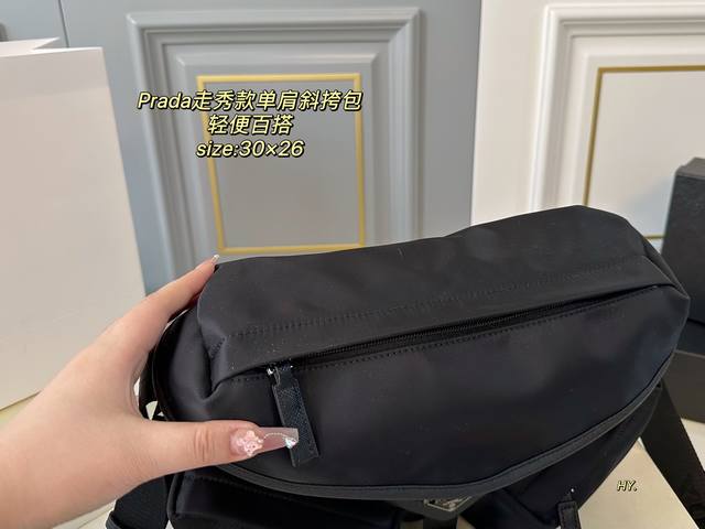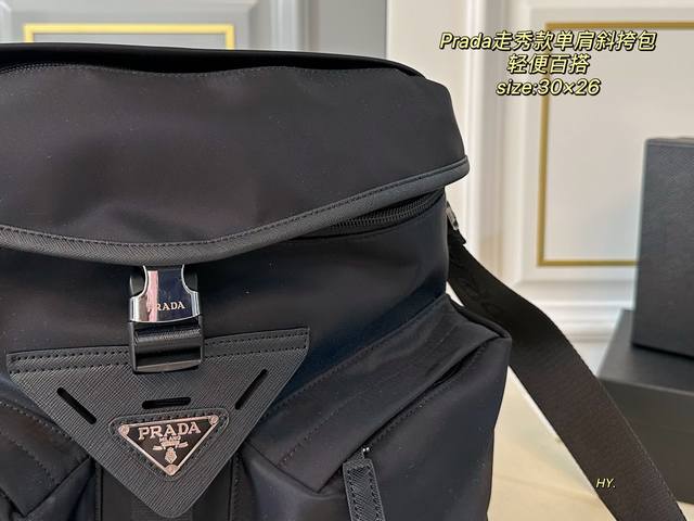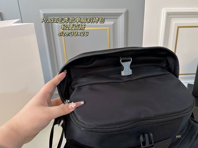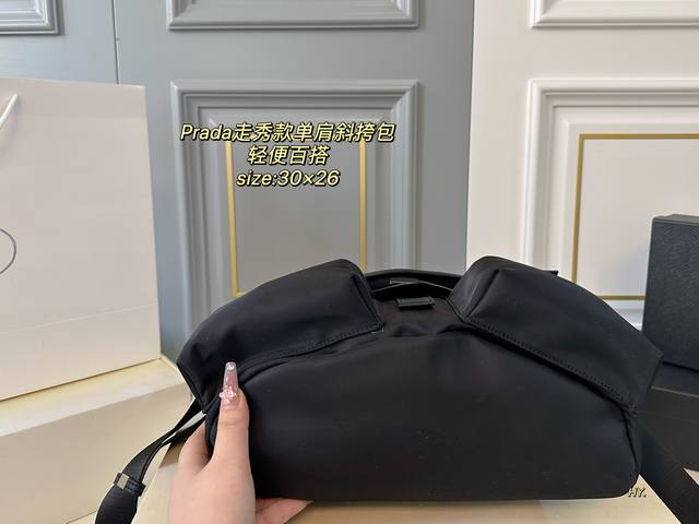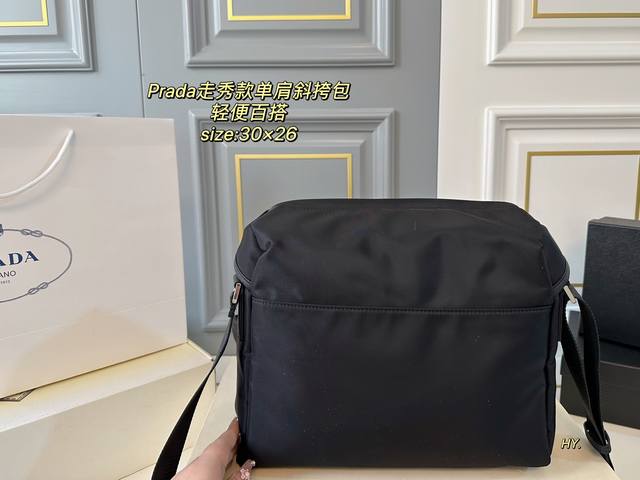 配盒 Size:30×26 Prada普拉达新款尼龙走秀款单肩斜挎包 造型真的是又酷又帅,时尚又实用 多个隔层,方便收纳和分类~ 进口材质,触感细腻且耐磨耐造