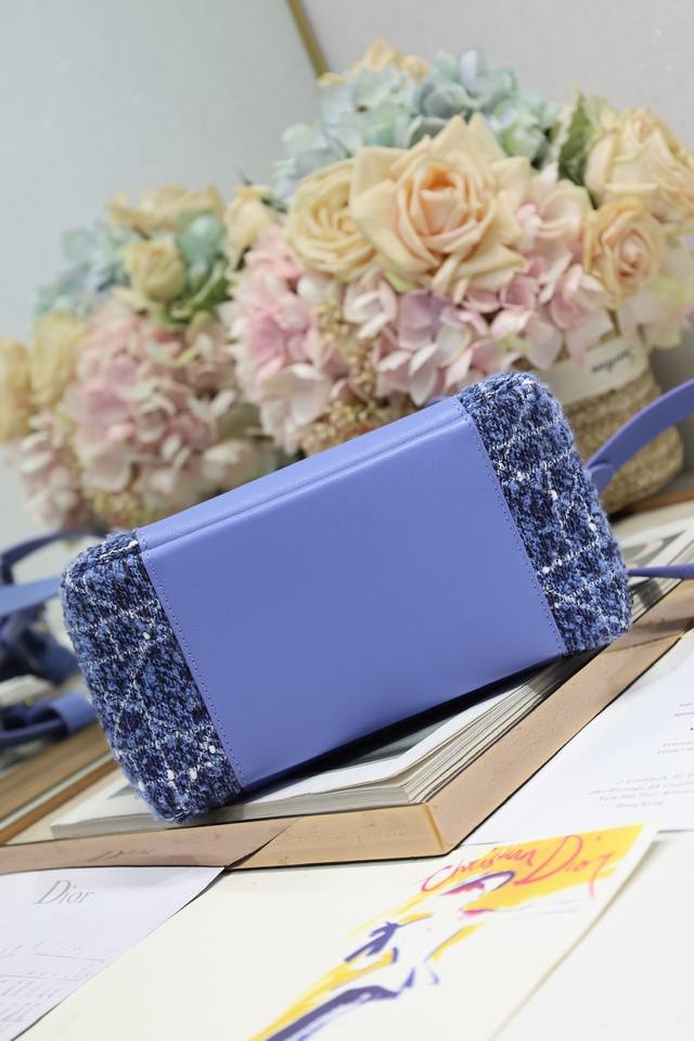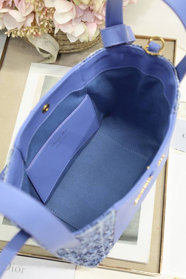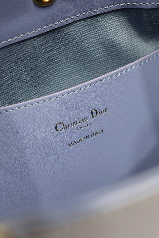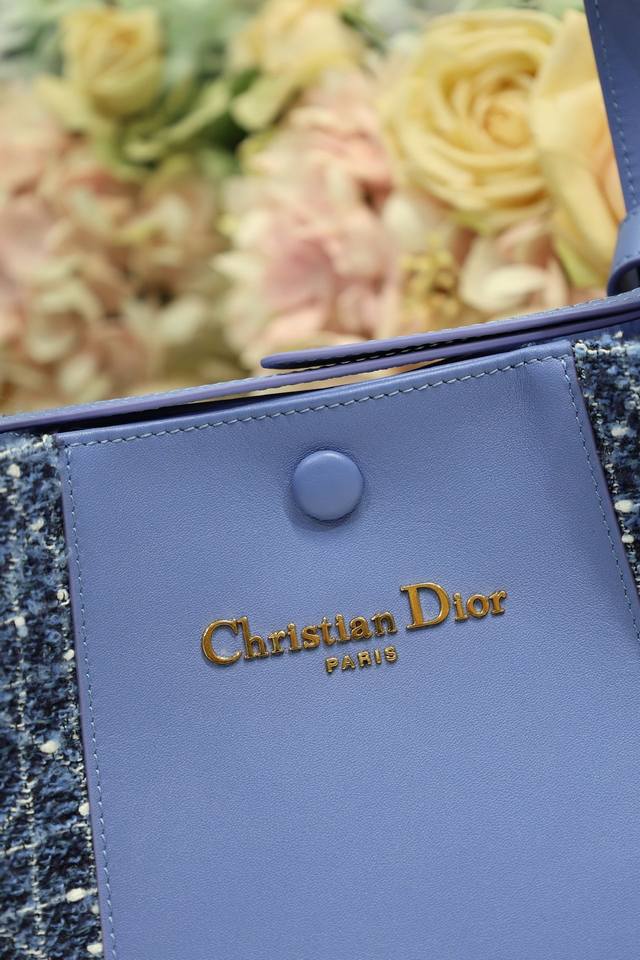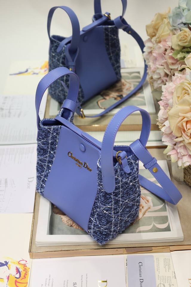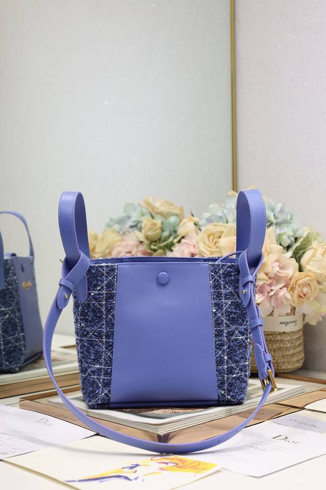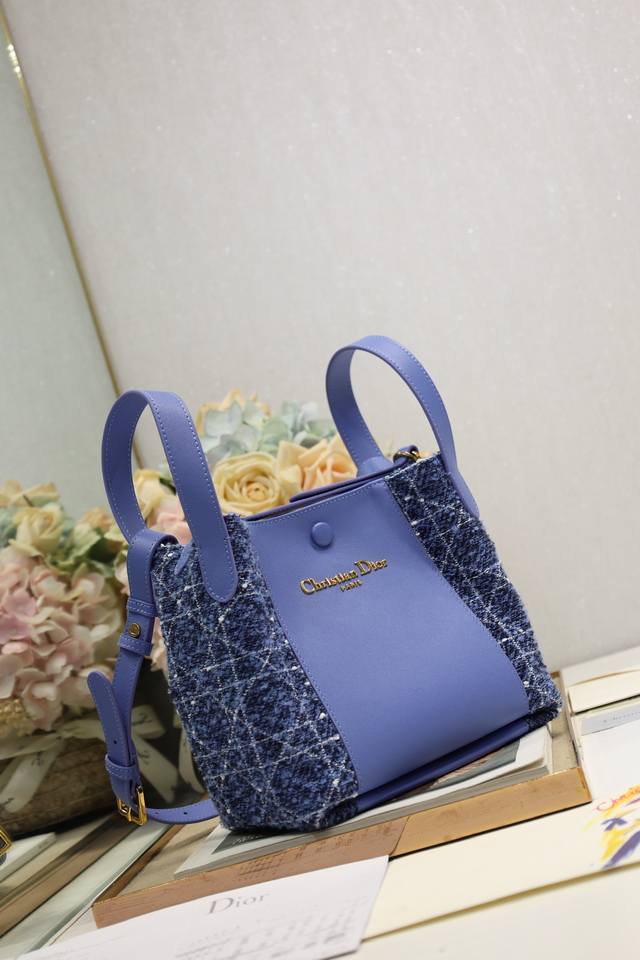 这款 Signature 水桶包是二零二五春夏成衣系列新品,突显柔软的廓形和百搭的设计。采用蓝色粗花呢等材质精心制作,饰以同色调光滑牛皮革细节,正面饰以复古金色饰面金属Christian Dior Paris标志。宽敞隔层搭配按扣和饰带开合,可安全收纳各种日常用品,设有插袋更显精致。小号款式,搭配顶部皮革手柄和可调节、可拆卸肩带,可轻松手提、肩背或斜挎。