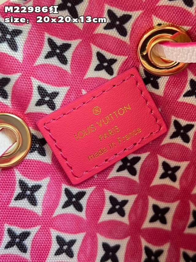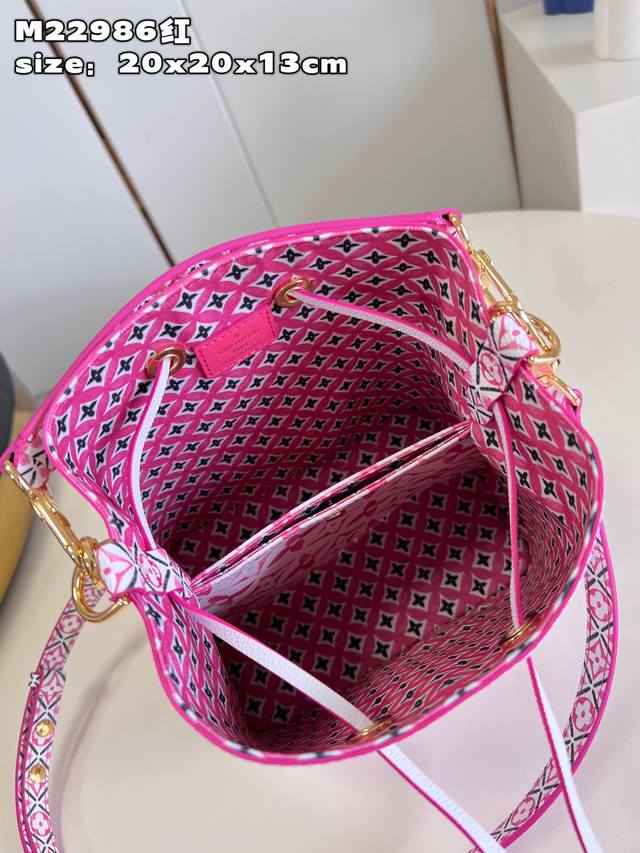 顶级原单 独家实拍 M22985玫红 本款 Neonoé 水桶包为淡雅帆布描绘 Giant Monogram 印花,令 Lv 和 Monogram 花卉呈现深浅不一的水彩效果,搭配抽绳和中央按扣内袋,流露闲适假日气息。Size:20X20X13Cm