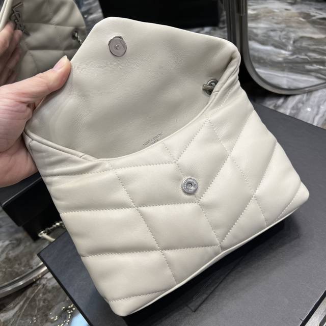 _迷你号斜挎包来袭!整包采用柔软的意大利小羊皮制作,搭配Y家斜条纹绗缝工艺,拥有柔和质地的前翻盖袋,搭配可拆卸肩带,可以做收纳包,还可以使用调节扣来做腋下包,轻松实现一包多用!