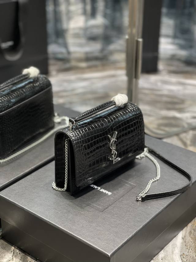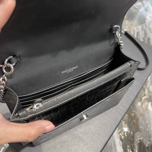 来了!来了!新款日落包鳄鱼纹版本它来了!延续经典的Sunset翻盖外形轮廓,对细节进行了一系列小改变,例如顶部增加了真皮手腕,肩带可以自由拆卸,内层增加了卡槽和三个功能区,使它变成了一只Woc小包,把整个包包安排得明明白白的!多种背法随意切换,可单肩背、可斜挎、可手拎、可手拿,一包多用,实用性杠杠滴!