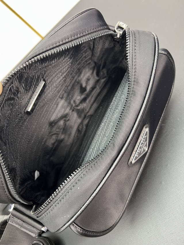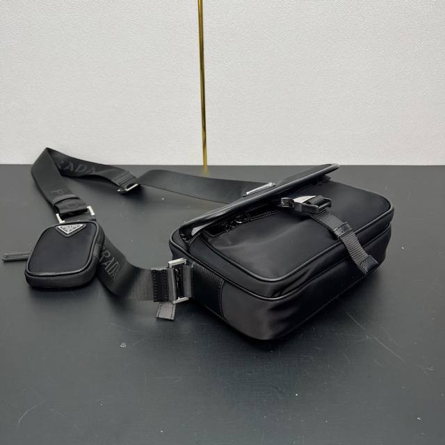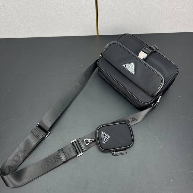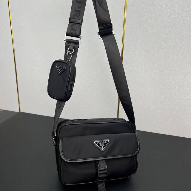这款斜挎包采用进口尼龙面料,顶级五金可拆卸可调式尼龙带和皮革肩带,配可拆卸小袋,翻盖涂珐琅金属三角形徽标