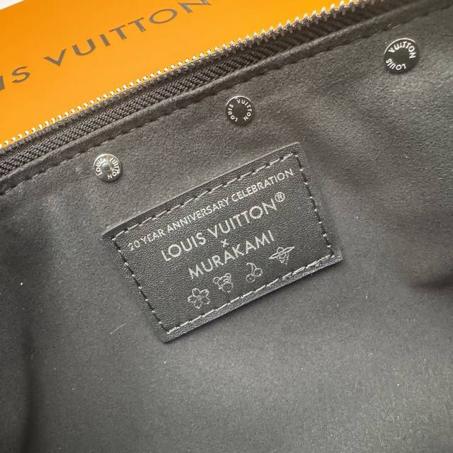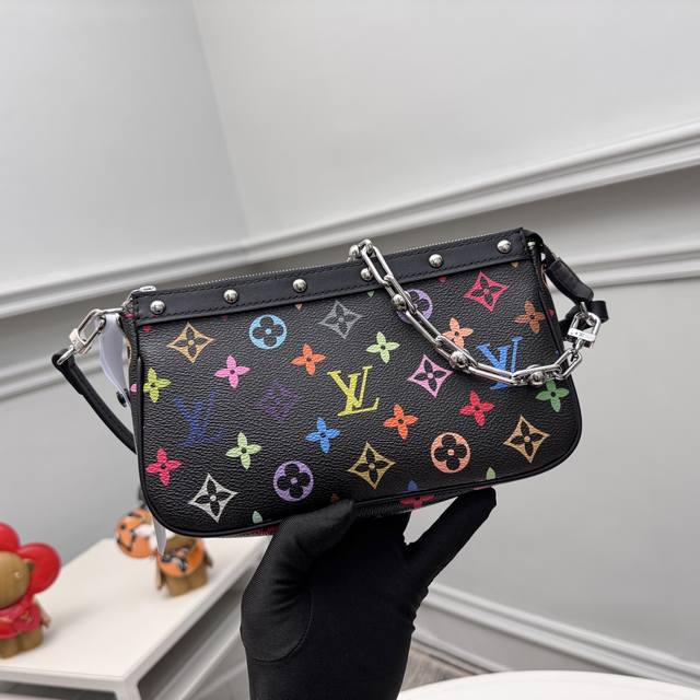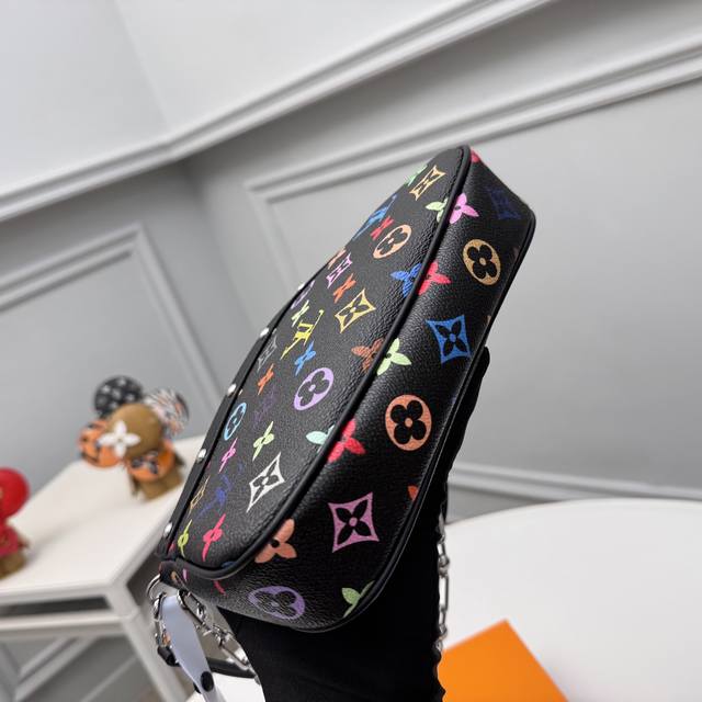 顶级原单 M13404黑彩芯片版Pochette Accessoires 手袋取材涂层帆布,以缤纷 Monogram 图案演绎路易威登 X 村上隆跨界合作系列的灵动格调。牛皮革饰边和耀目金属件点睛考究细节,可拆卸肩带和链条实现灵活背携。尺寸:13 X 4 X 22厘米。