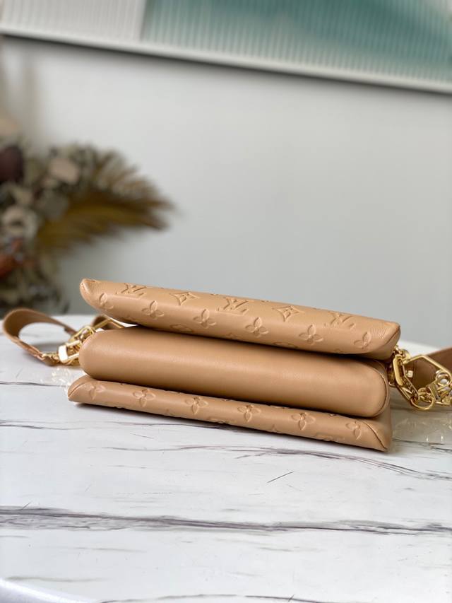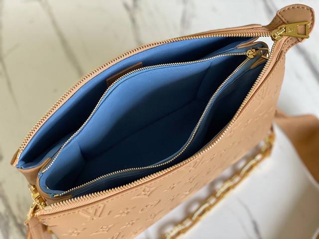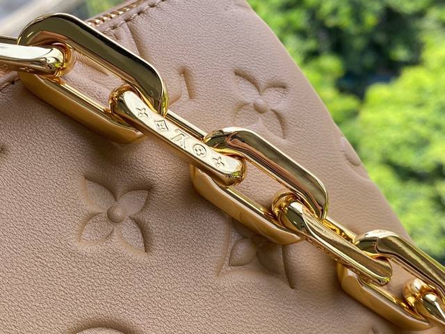 顶级原厂 M57791 杏色 本款 Coussin 小号手袋出自 Vuittamins 胶囊系列,为蓬松绵羊皮点缀粗犷链条,以鲜明色彩道出 Nicolas GhesquièRe 对自信欢悦的解读。可利用肩带斜挎或作为链条法棍包,亦可携于腋下。尺寸:26 X 20 X 12 厘米