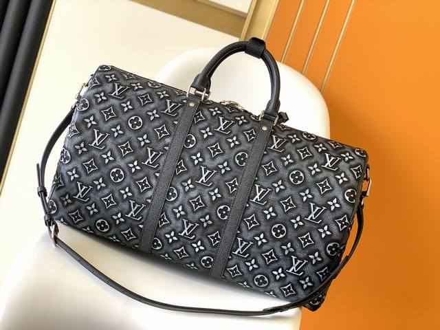 头层顶级原单 M57955黑 City Keepall 手袋 取材 Monogram Seal 牛皮,以舒软质感烘托路易威登历经时光考验的 Monogram 压